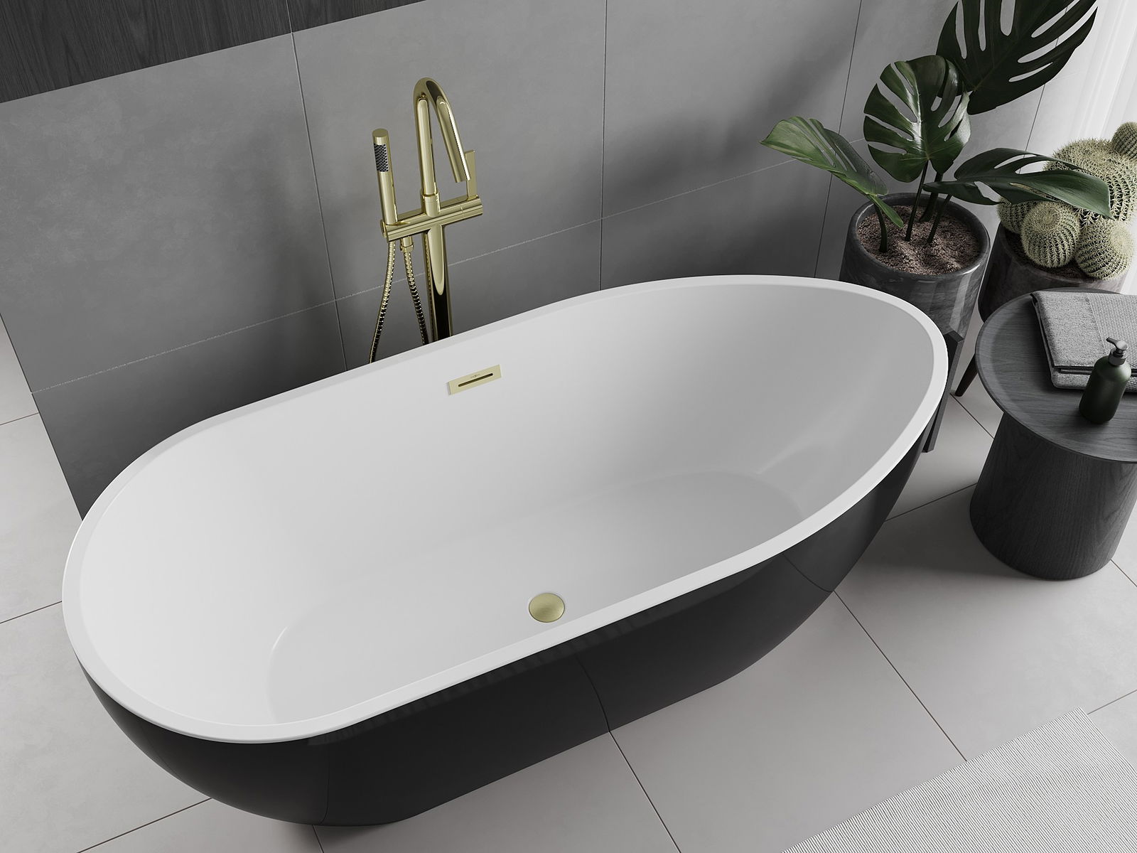 We offer a freestanding bath with dimensions 170 x 75 cm, in an elegant combination of white and black colours, with a gold brushed finish. Its oval shape and high-quality sanitary acrylic ensure comfort and aesthetics at the highest level. The bath is freestanding, easy to install, and has a centrally located drain. Additionally, it is designed with resistance to tarnishing and UV radiation in mind, ensuring long-term use without quality loss.