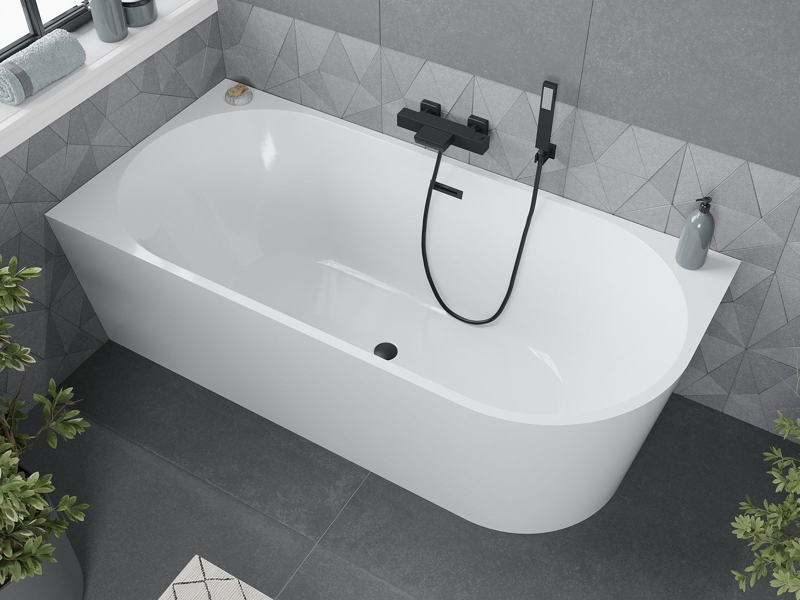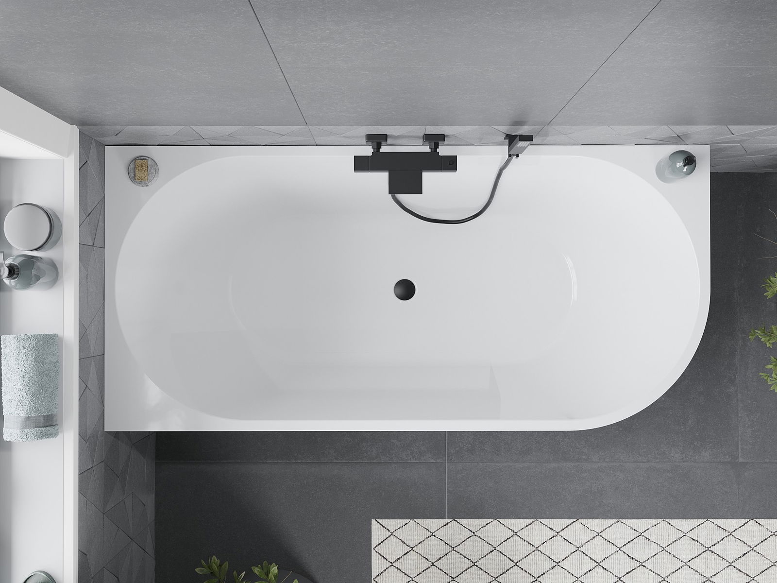 The Mexen Mia is an elegant freestanding corner bathtub measuring 160 x 75 cm, ideal for modern bathrooms. Made of durable sanitary acrylic, it is resistant to dulling and UV radiation. The black overflow gives it a stylish appearance, and the glossy surface makes it easy to clean. The set includes a siphon and click-clack plug for easy installation. Thanks to its corner design, the bathtub fits perfectly into various spatial arrangements.