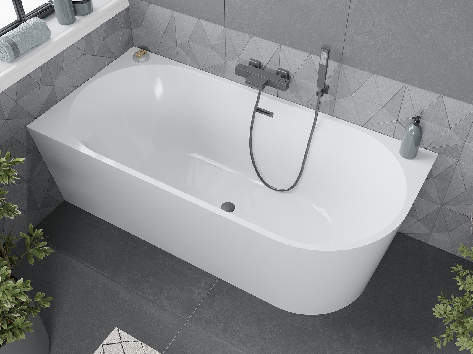 Mexen Mia is an elegant freestanding corner bathtub measuring 160 x 75 cm, ideal for modern bathrooms. It provides comfort with a height of 58 cm and a depth of 45 cm. Made from sanitary acrylic, it features resistance to dulling and UV radiation for long-lasting quality. The glossy white surface and gun metal elements add style. The bathtub is easy to install and equipped with an overflow hole and a siphon with a click-clack drain plug.