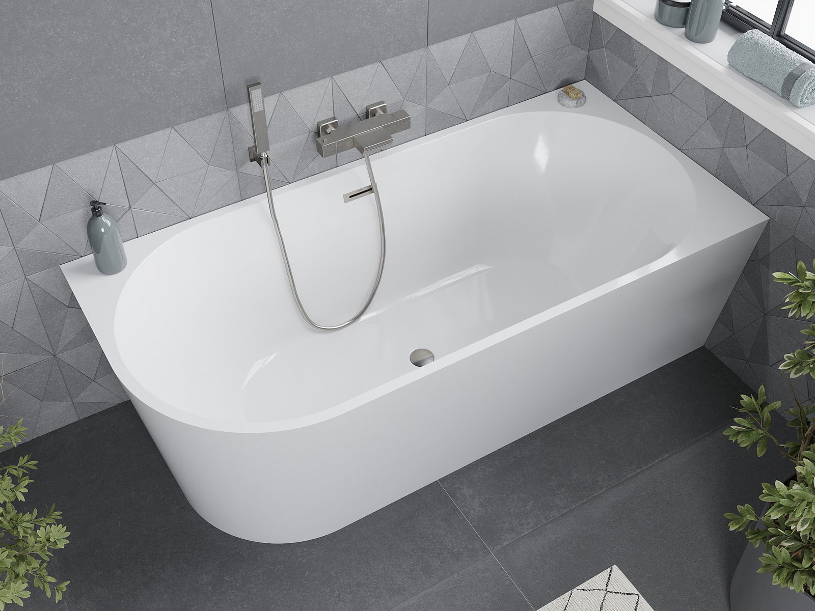 Mexen Mia is a stylish free-standing corner bathtub with dimensions of 160 x 75 cm, made from sanitary acrylic in an elegant white color. Its modern design and rectangular shape fit perfectly in any bathroom. The bathtub is 58 cm high and 45 cm deep, providing comfort during use. Equipped with an overflow hole and a siphon set with a click-clack plug, it is resistant to tarnishing and UV radiation. An additional advantage is the brushed nickel finish, which adds unique character.