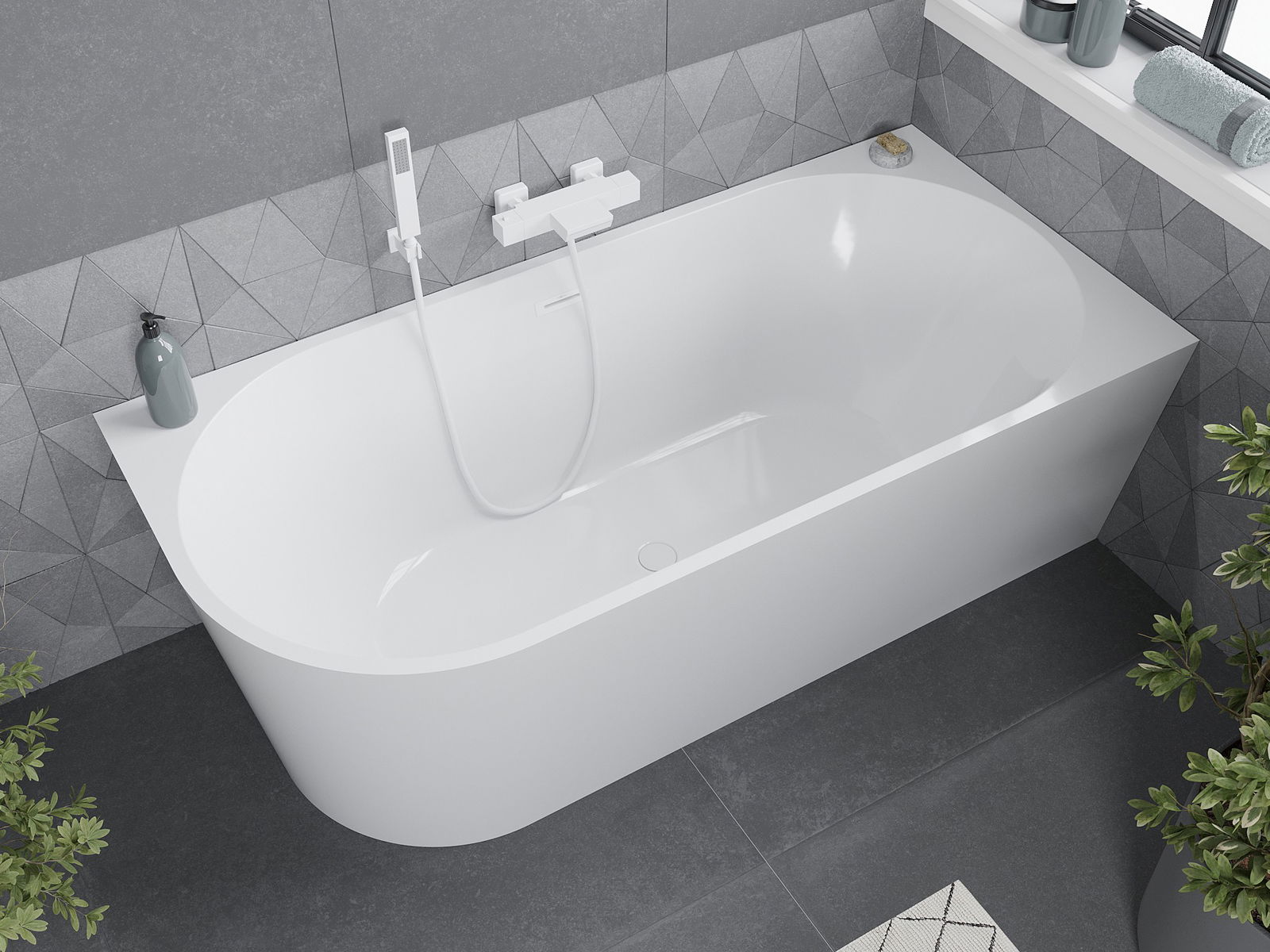 Mexen Mia is a freestanding corner bathtub measuring 170 x 80 cm, offering comfort and modern design. Made of sanitary acrylic, it features a white, glossy finish, contributing to its elegant appearance. The bathtub has a central drain and overflow hole, enhancing its functionality. Resistance to dulling and UV radiation ensures the product's longevity. The set includes a siphon and click clack plug, facilitating installation.