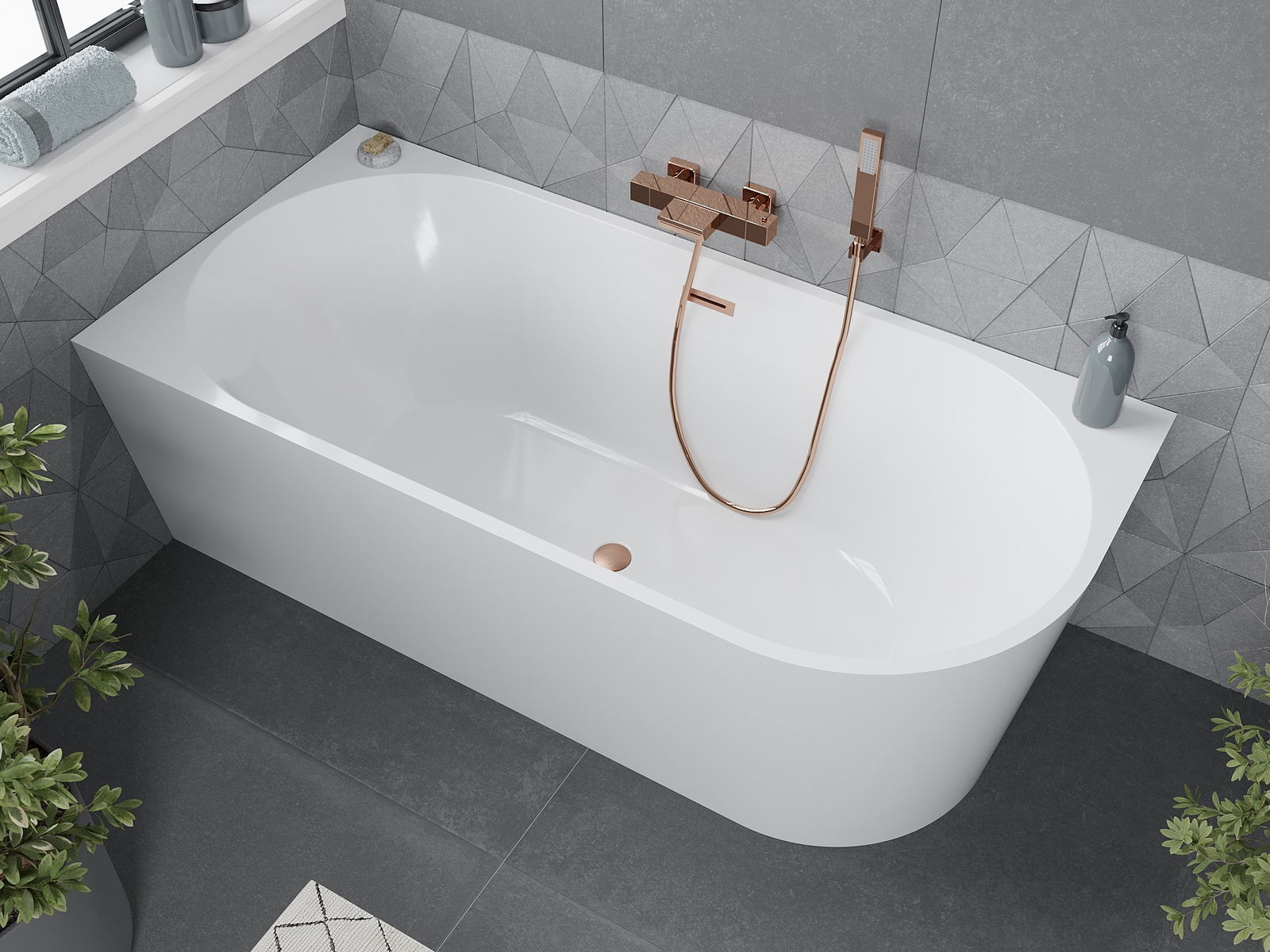 Mia is an elegant freestanding bathtub, ideal for modern bathrooms. With dimensions of 180 x 80 cm and a depth of 45 cm, it provides comfort during baths. Made from sanitary acrylic, it features resistance to dulling and UV radiation, ensuring durability. The white glossy surface and copper brushed finish add a touch of class. The bathtub includes an overflow hole and comes with a siphon and click-clack plug, making installation easier.
