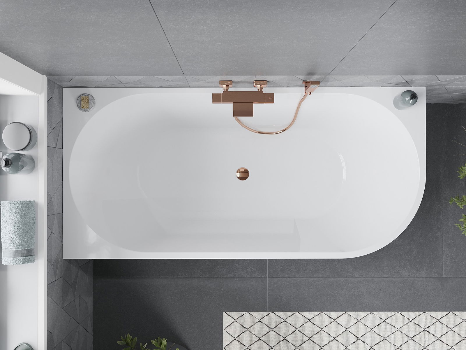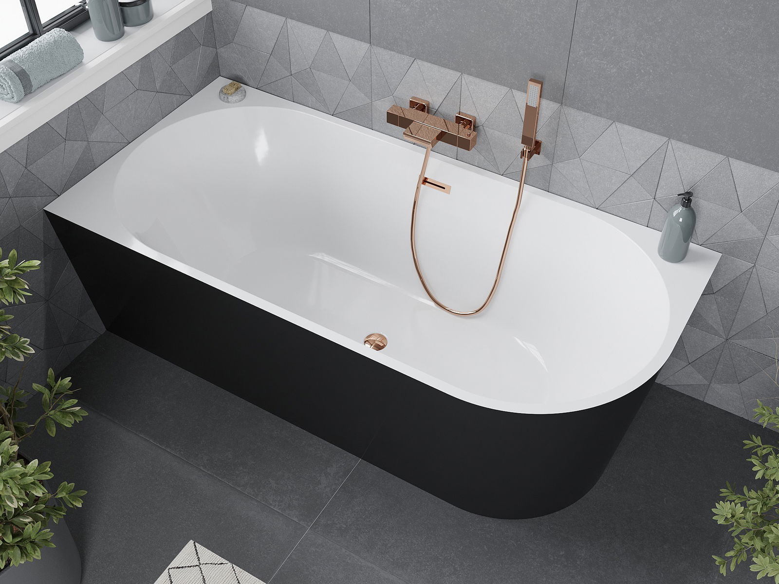 The Mexen Mia 180 x 80 cm freestanding corner bathtub is the perfect combination of functionality and elegance. Made of sanitary acrylic, it offers high resistance to tarnishing and UV radiation. Its rectangular shape and the combination of white and black colors give the interior a modern style. With a depth of 45 cm and a height of 58 cm, it provides comfort during bathing. The bathtub features an overflow hole and a siphon and click-clack plug set in rose gold color, adding a unique character.
