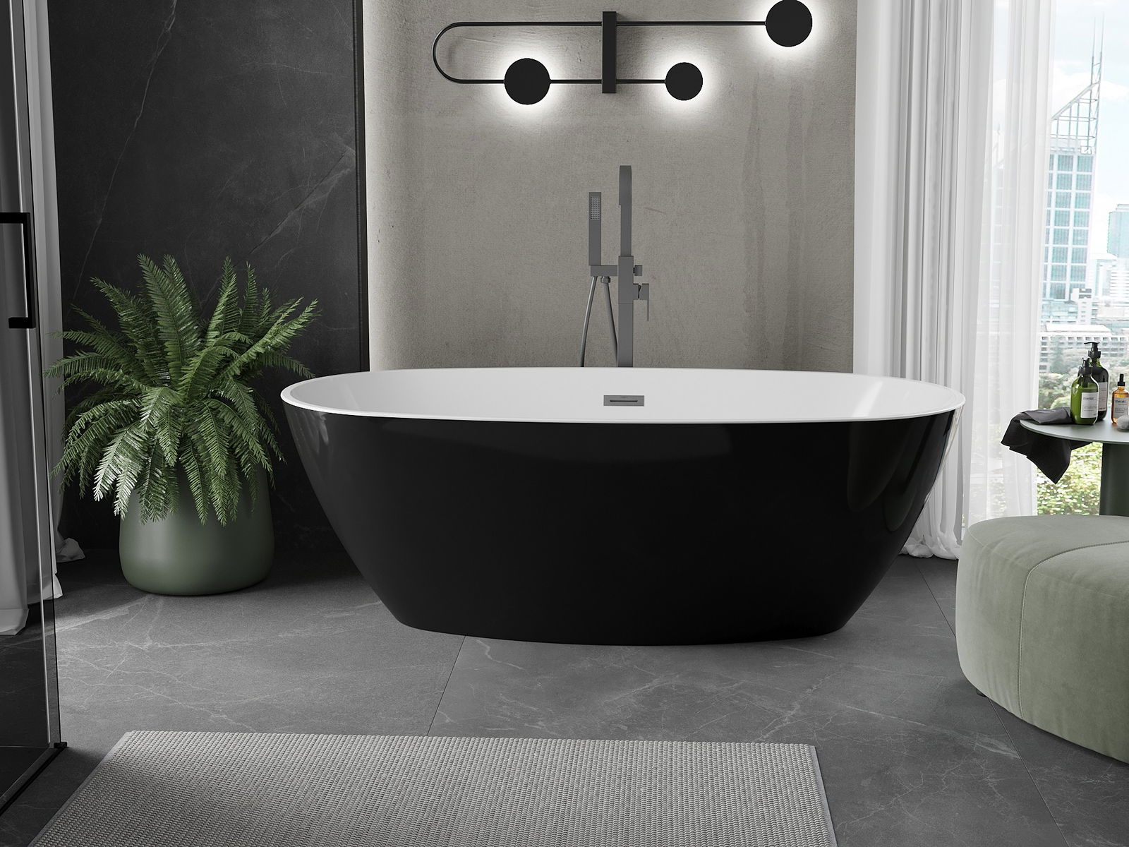 The Mexen Eris is an elegant free-standing bathtub measuring 180 x 80 cm, made from sanitary acrylic, ensuring durability and ease of cleaning. Its oval shape and white color with black accents add a modern touch to any bathroom. The brushed gun gray finish and central drain are additional features that enhance functionality. The bathtub is resistant to fading and UV radiation, ensuring it maintains its exceptional appearance for longer.