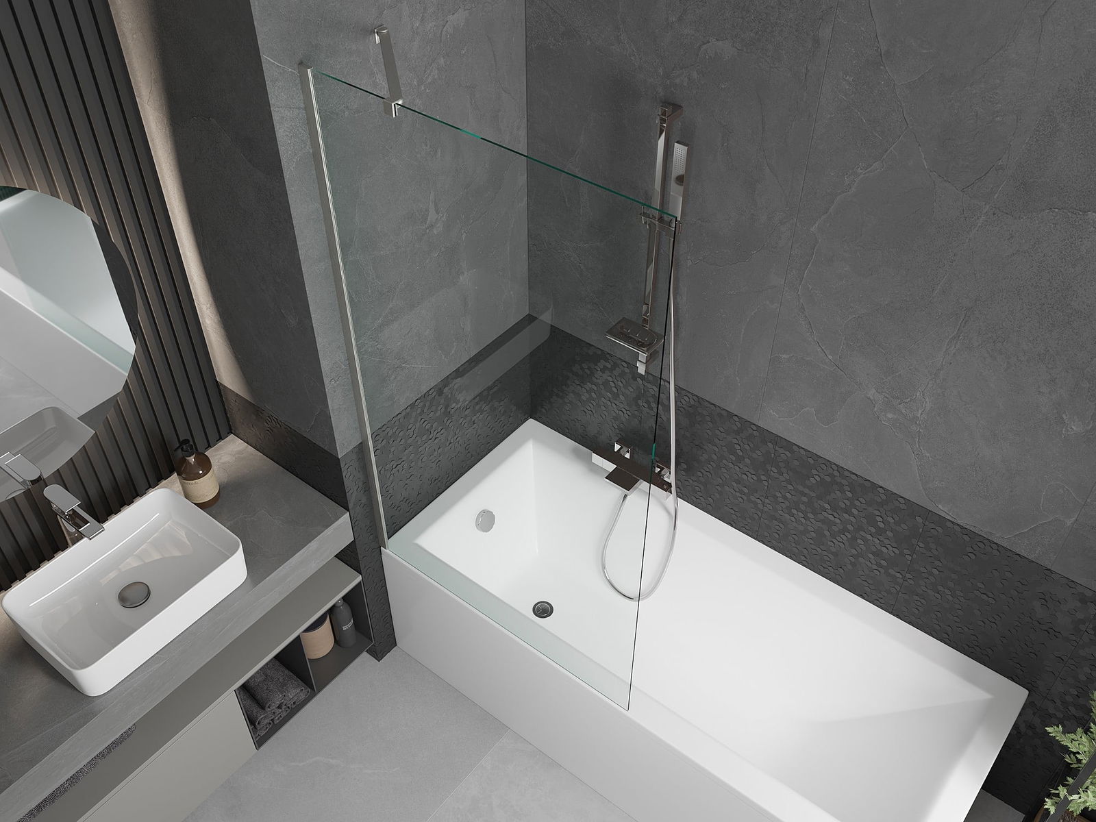 Effective protection against water spilling during bathing. The screen has seals that perfectly fit the glass surface and the edge of the bathtub. A functional solution ensuring safety and easy maintenance of cleanliness.