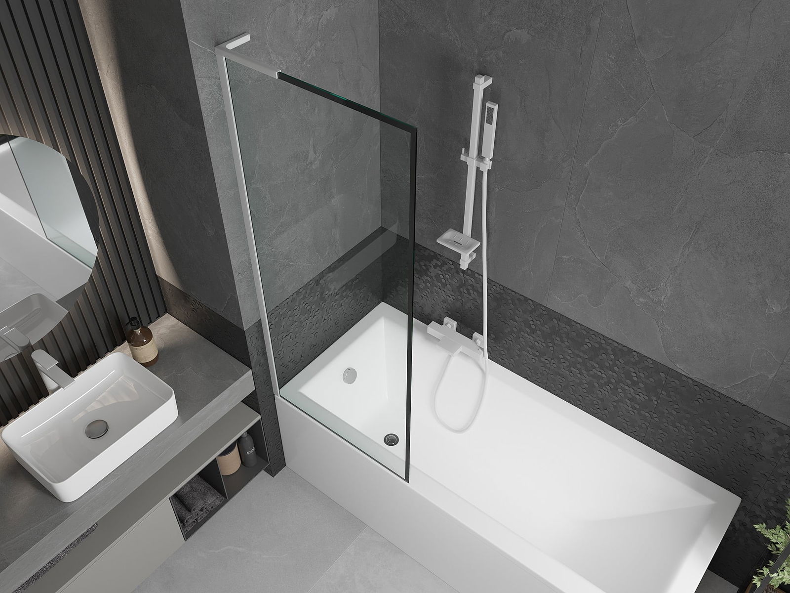 Effective protection against water spilling during bathing. The screen has seals that perfectly fit the glass surface and the edge of the bathtub. A functional solution ensuring safety and easy maintenance of cleanliness.