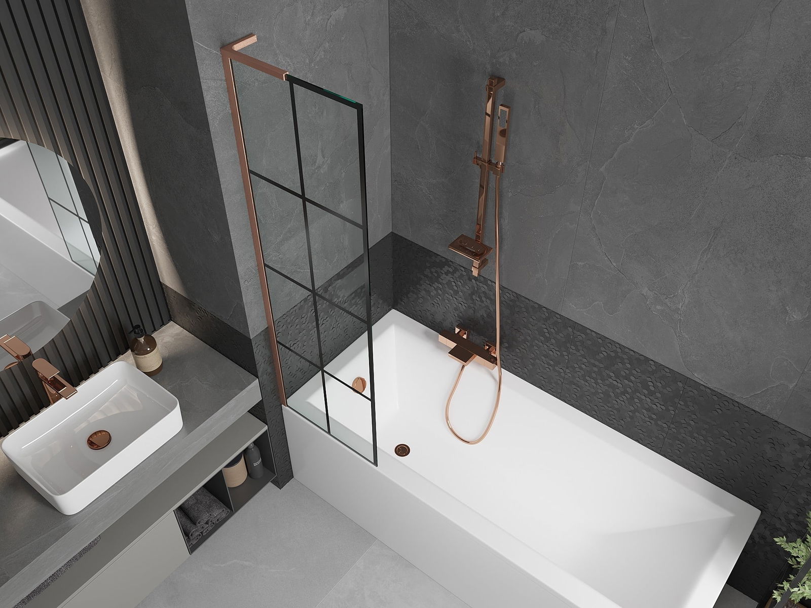 Mexen Next L 1-wing Bath Screen 50 x 150 cm, Black Grid, Brushed Copper - 895-050-000-03-77-65
