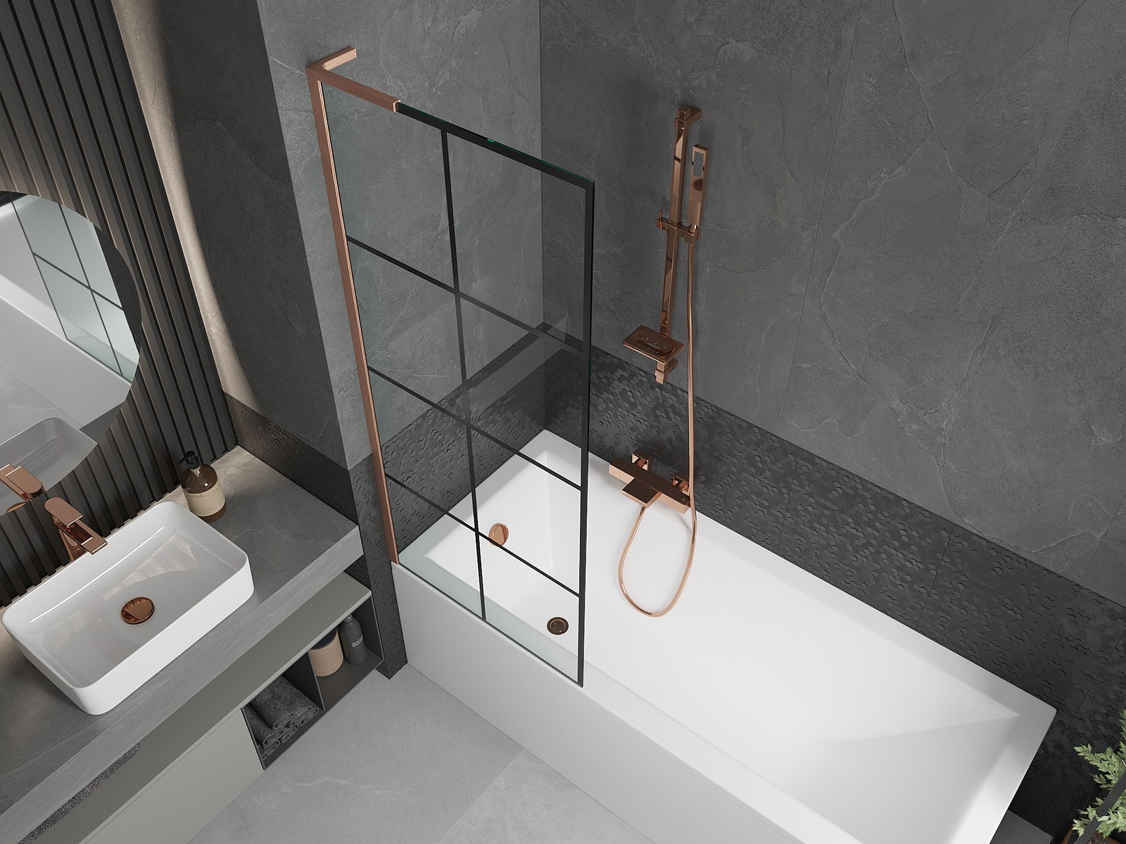 Mexen Next L Bathtub Screen 1-panel 70 x 150 cm, Black Grid, Brushed Copper - 895-070-000-03-77-65