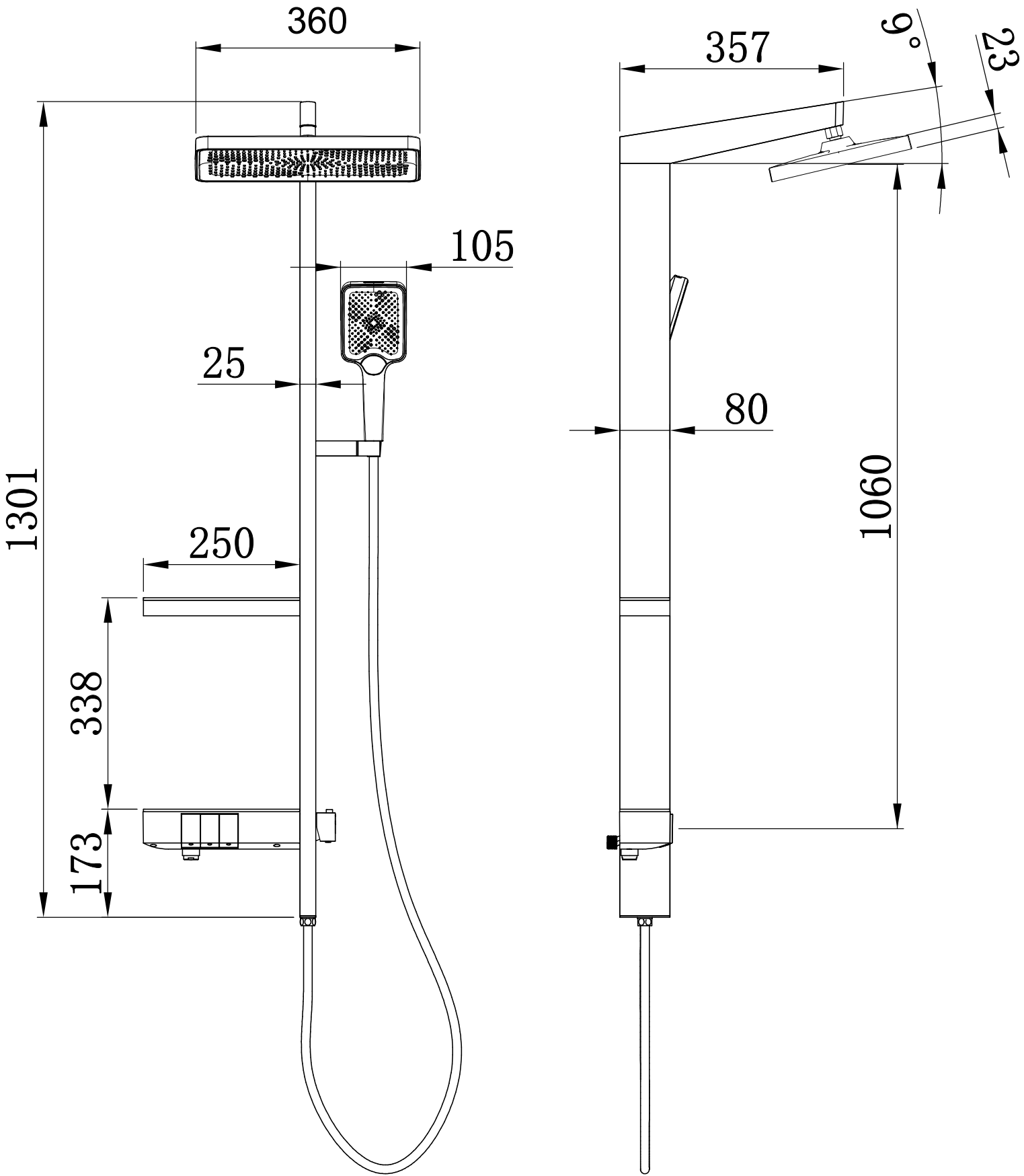 Shower head size: 230 x 360 mm