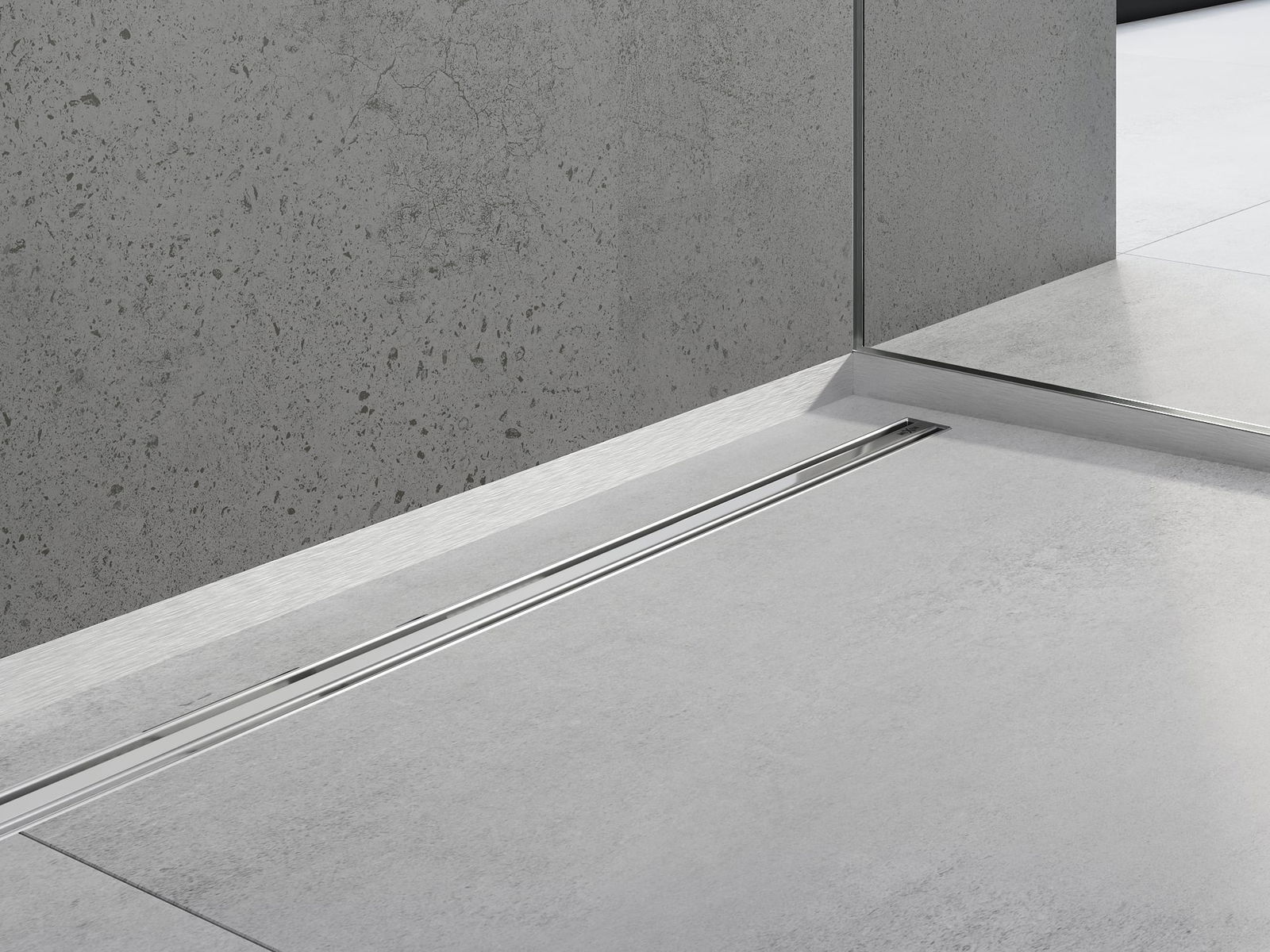 The front strip complements the use of slope strips, creating a cohesive whole in the shower area