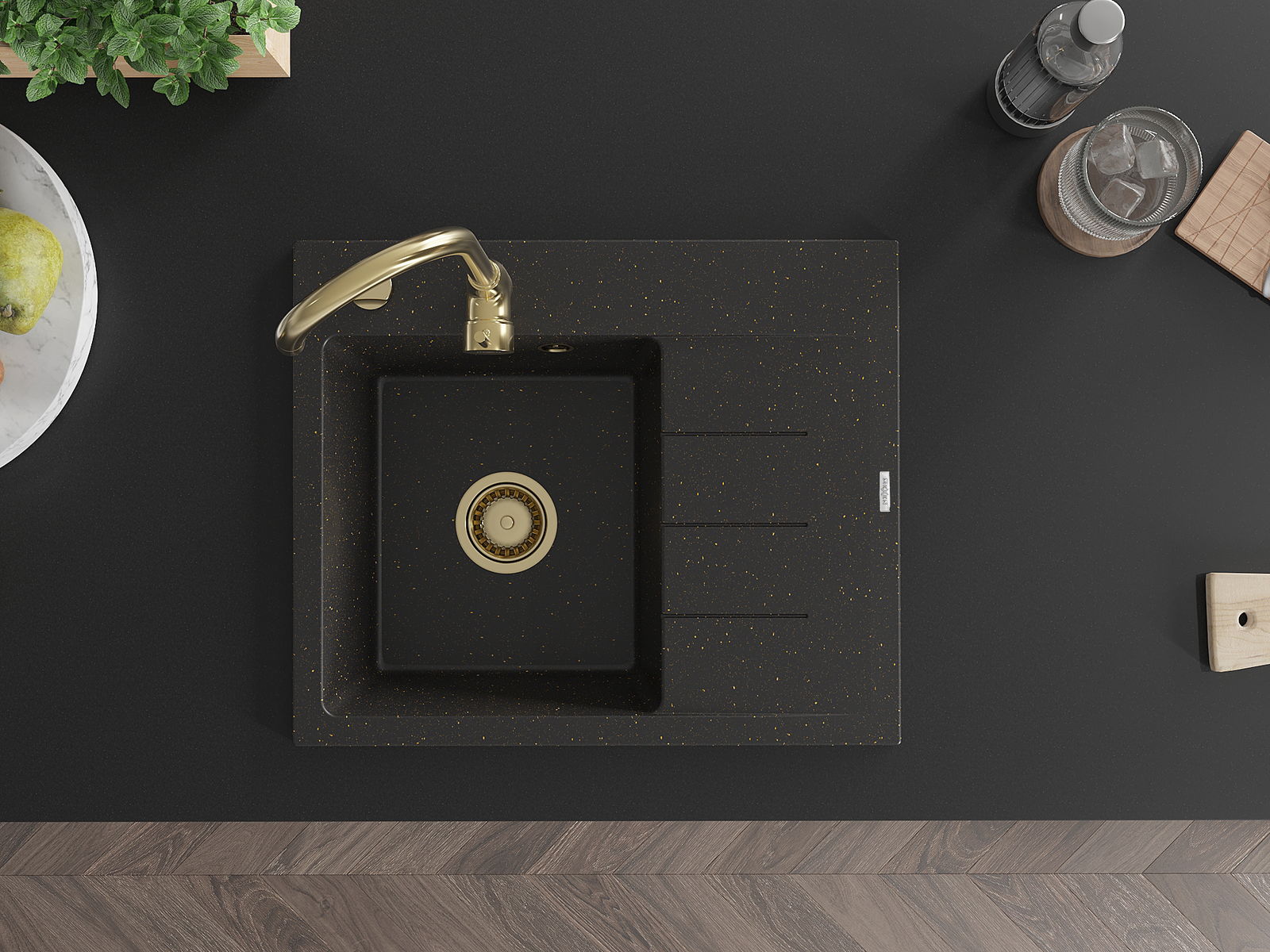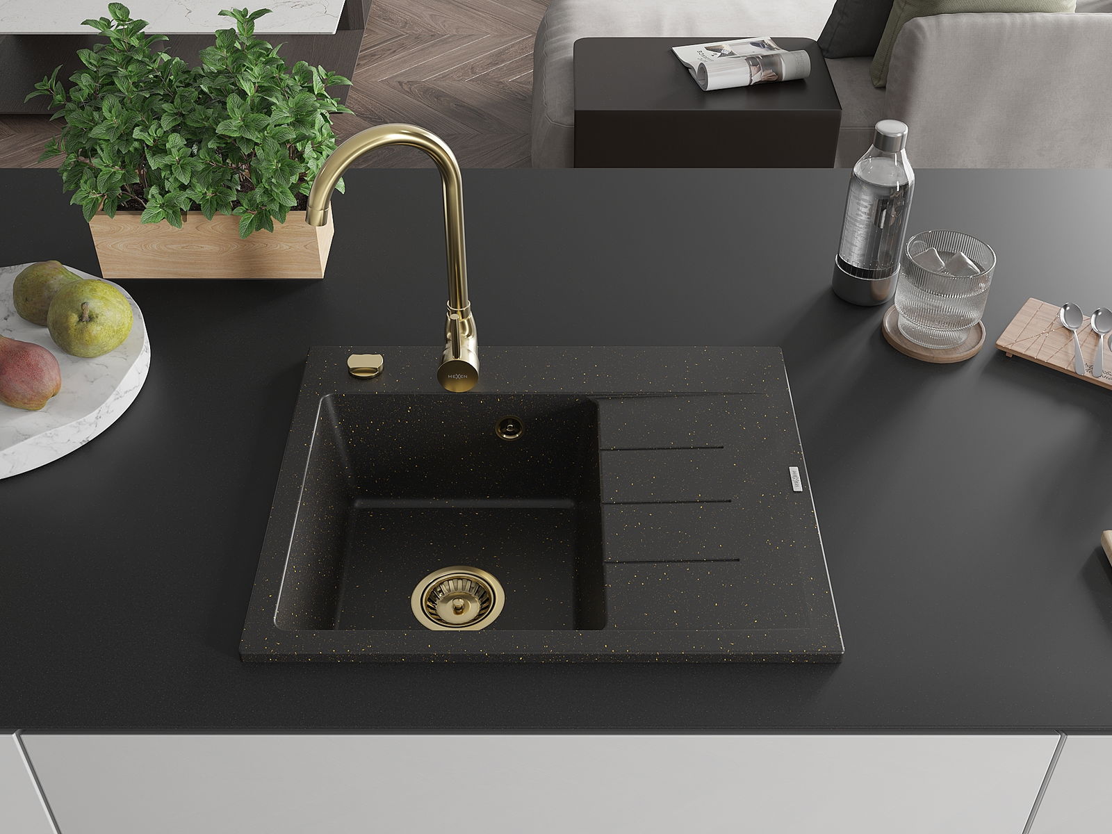 Mexen Ben granite sink 1-bowl with drainer, left 600 x 500 mm, black/gold metallic, gold siphon - 6522605000-75-G