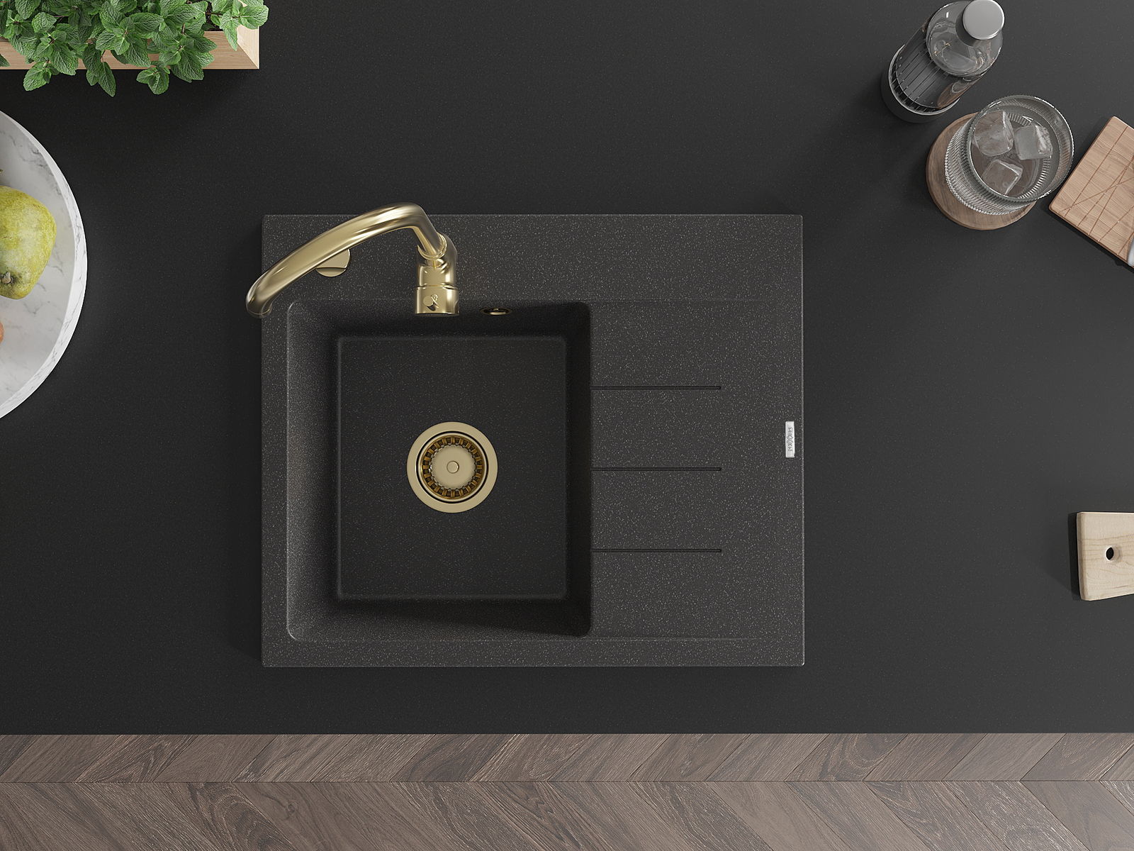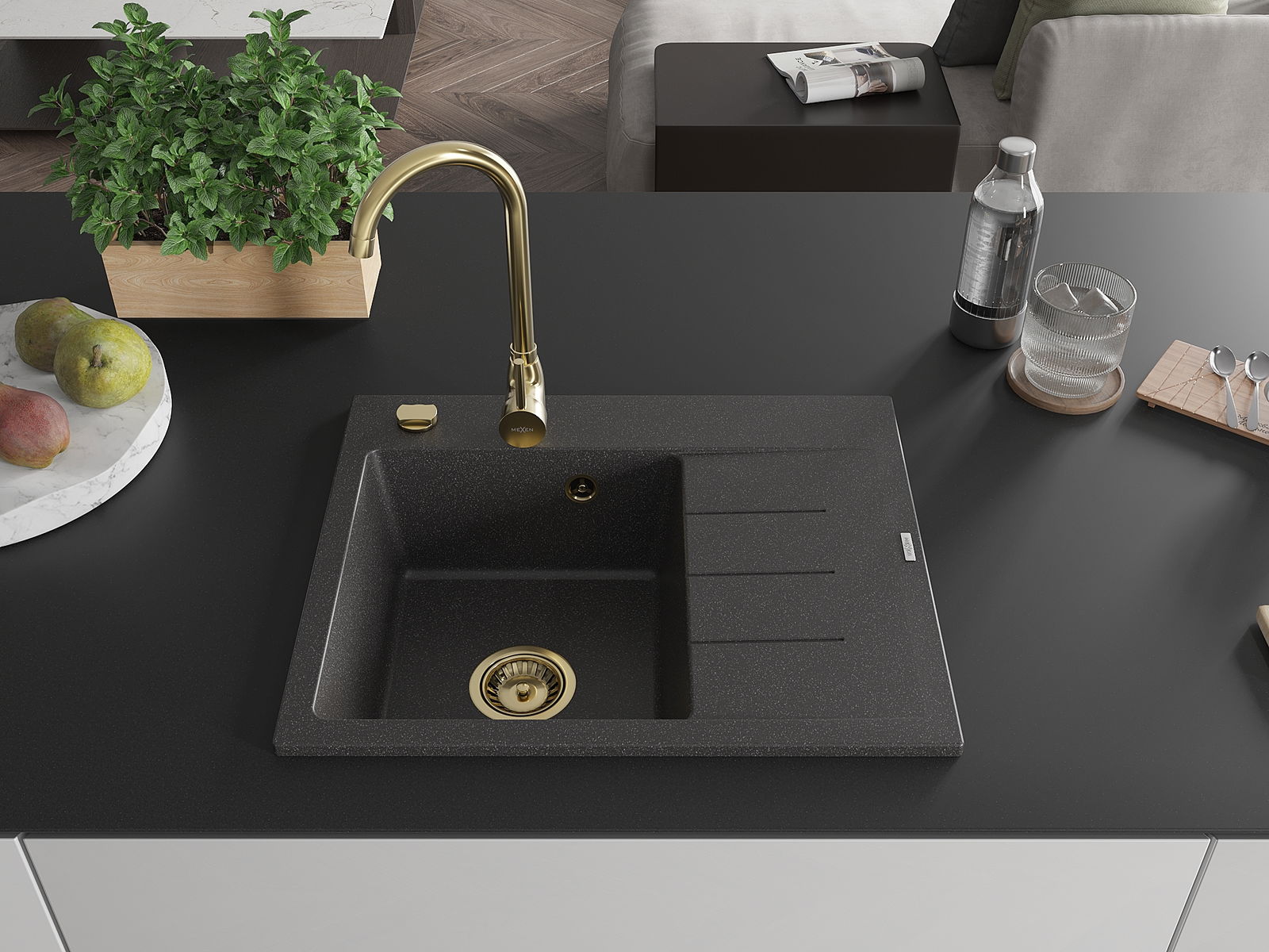 Mexen Ben granite sink with 1 bowl and drainer, left 600 x 500 mm, black speckled, golden siphon - 6522605000-76-G