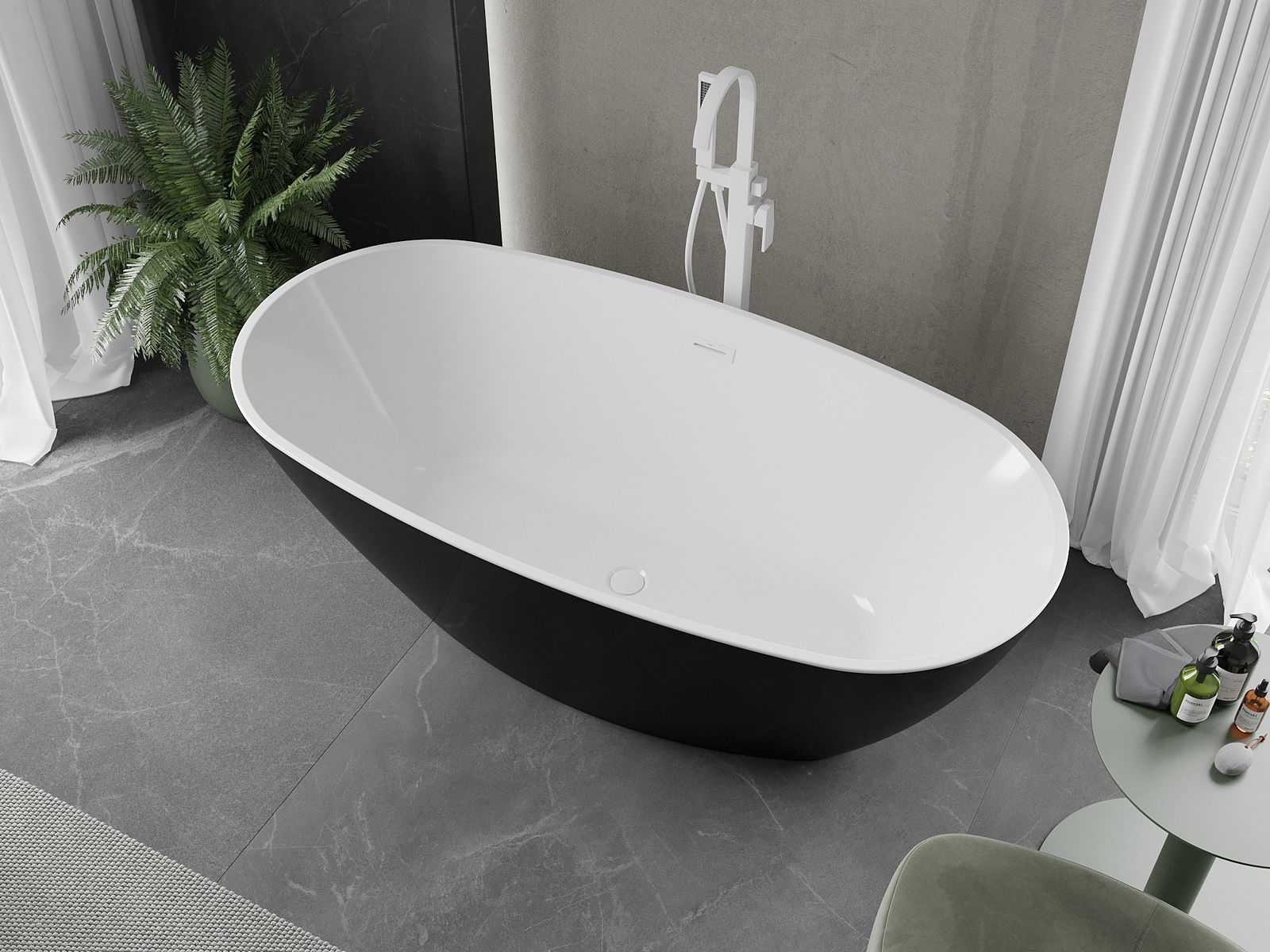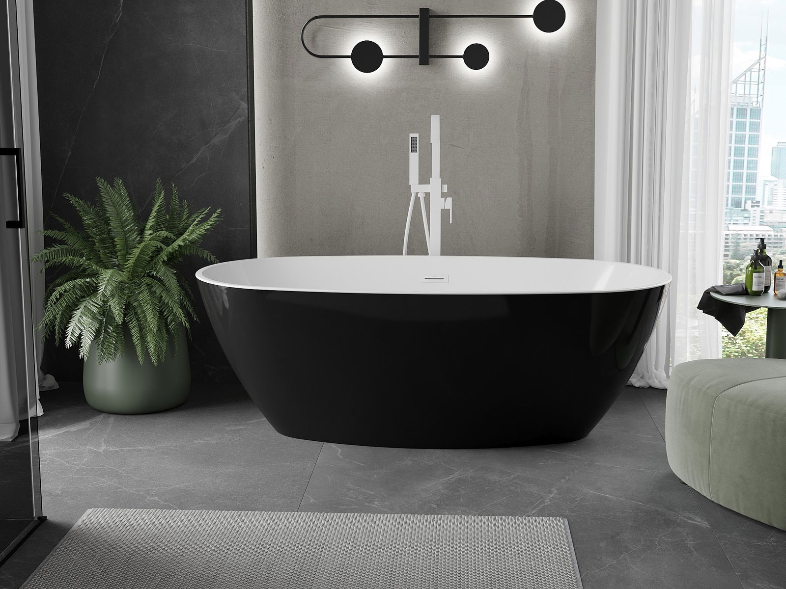 Mexen Eris is an elegant freestanding bath with dimensions of 180 x 95 cm, made from sanitary acrylic, providing exceptional durability and resistance to tarnishing and UV radiation. It features an oval shape and glossy surface, along with a white and black colour scheme, making it perfect for modern bathrooms. The bath includes an overflow hole and freestanding installation, and the set comes with a siphon and click-clack plug, ensuring full functionality.