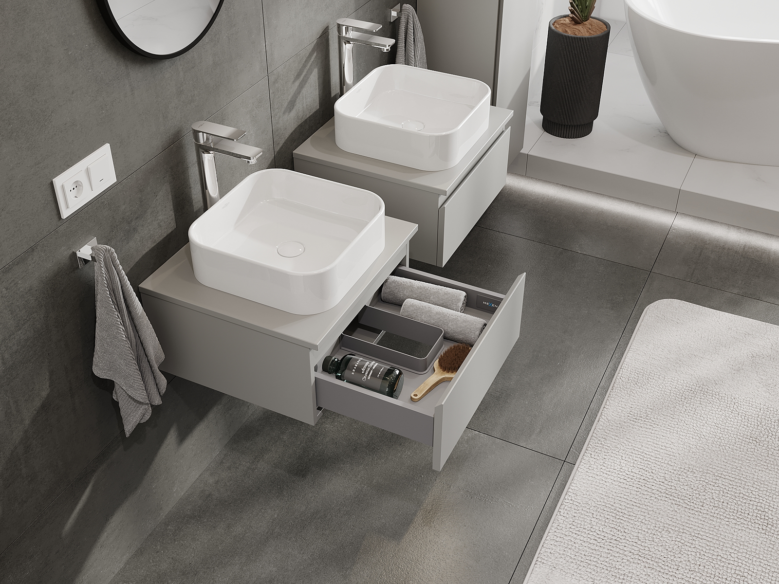 Our modular bathroom furniture can be combined in various colour configurations, allowing for complete personalisation. You can choose both the appearance and functions of individual elements, enabling you to adapt the furniture to your own stylistic and functional preferences.