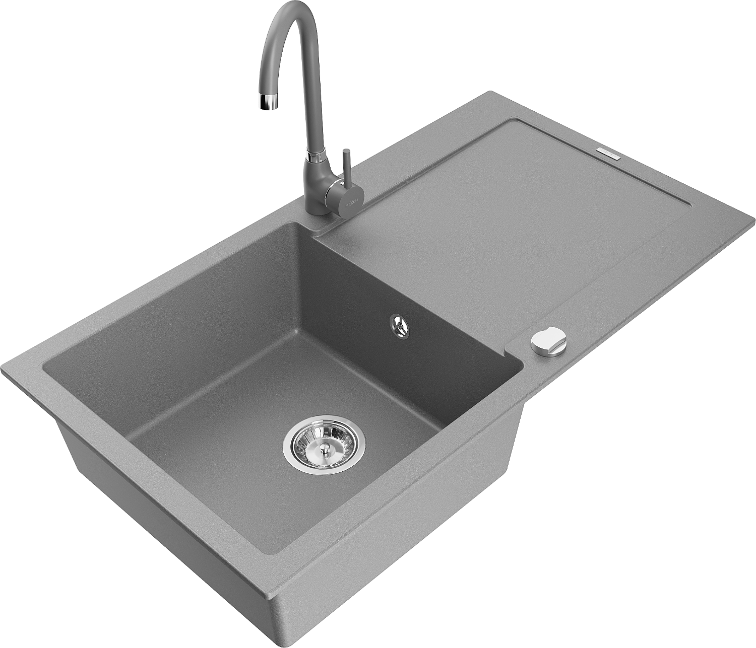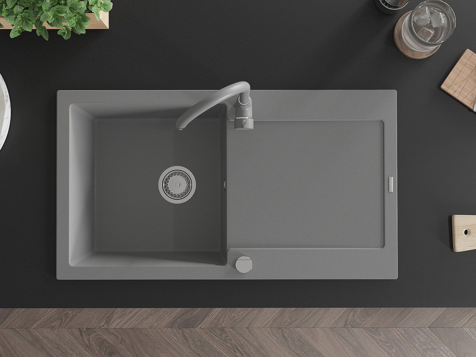 Mexen Leo granite kitchen sink 1-bowl with drainer and Telma kitchen tap, grey - 6501-71-670200-71