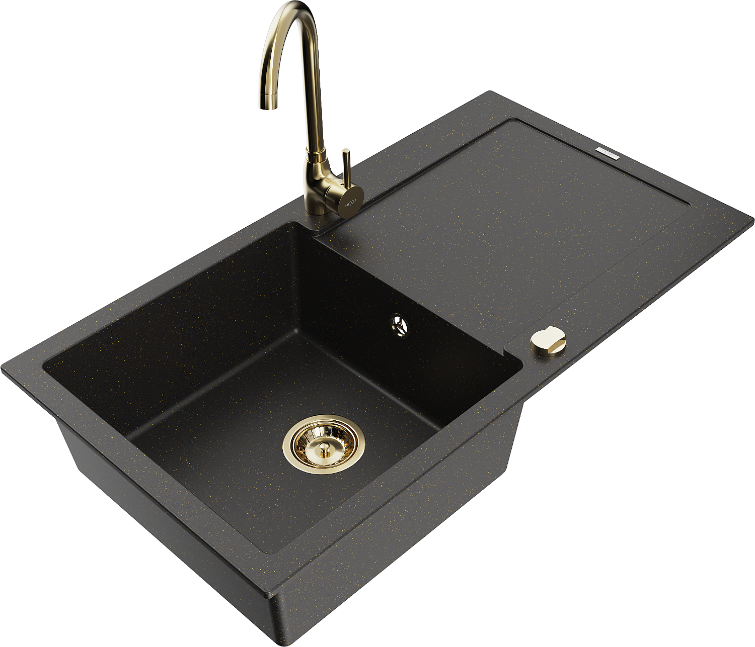Mexen Leo granite kitchen sink with one bowl, drainer and Telma kitchen tap, black/gold metallic - 6501-75-670200-50