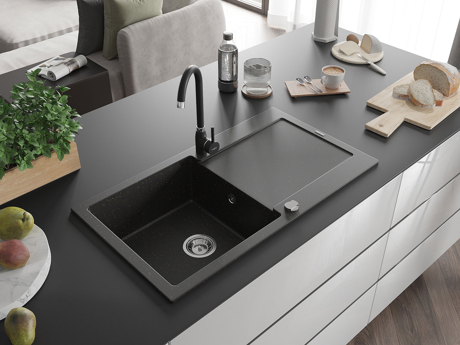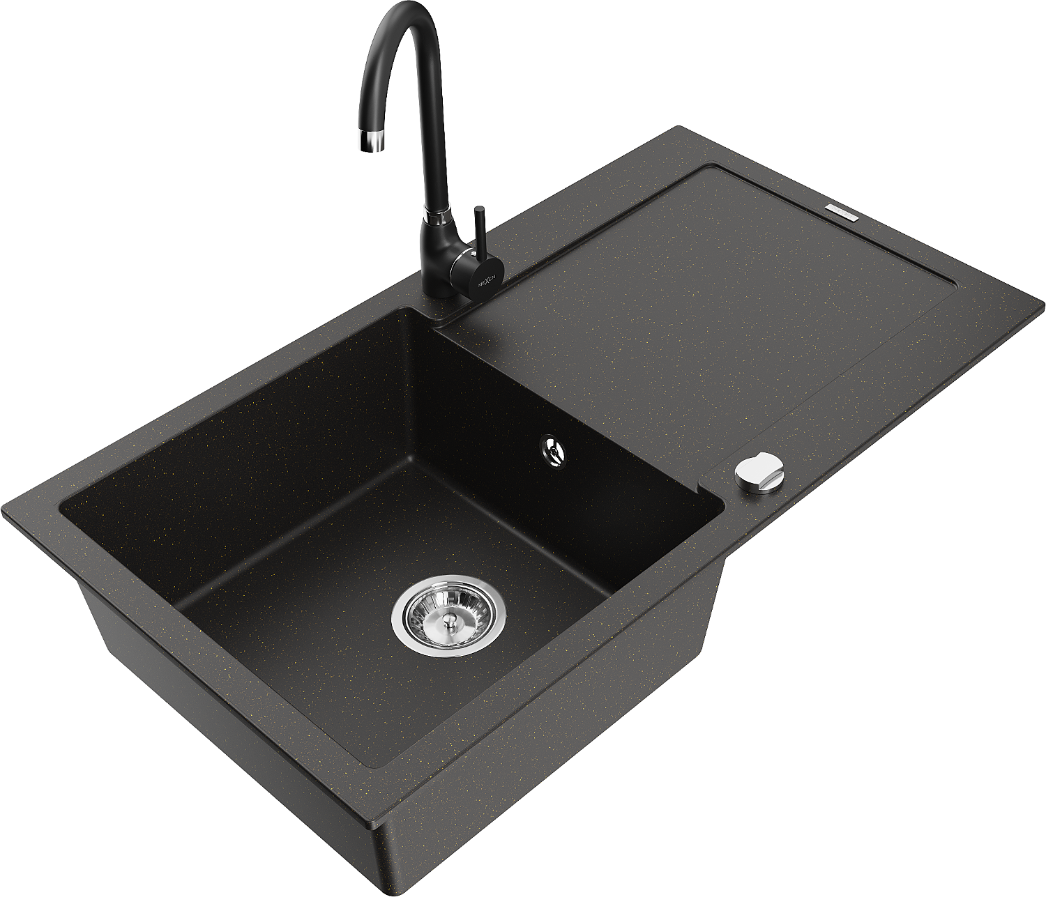 Mexen Leo Granite Sink 1-Bowl with Drainer and Telma Kitchen Faucet, Black/Gold Metallic - 6501-75-670200-70