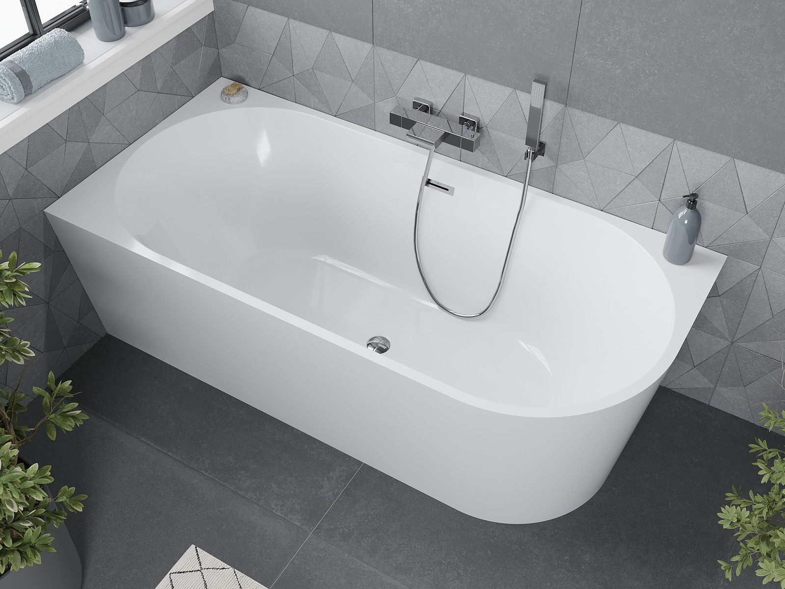 Mexen Mia is an elegant freestanding corner bathtub measuring 180 x 80 cm, which perfectly fits modern interiors. Made of sanitary acrylic, it ensures durability and resistance to tarnishing and UV radiation. The glossy white surface, chrome finish, and overflow hole are additional advantages of this product. The bathtub is designed for corner installation, and the set includes a siphon and click-clack plug, making it a practical choice for any bathroom project.