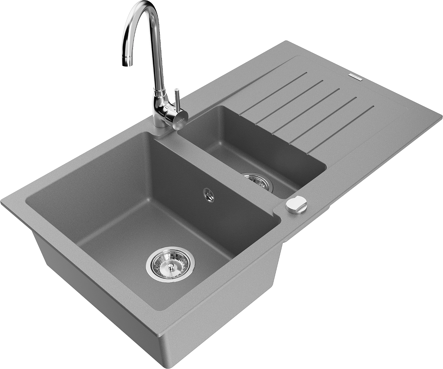 Mexen Matias granite kitchen sink 1.5-bowl with drainer and Telma kitchen tap, grey - 6502-71-670200-00