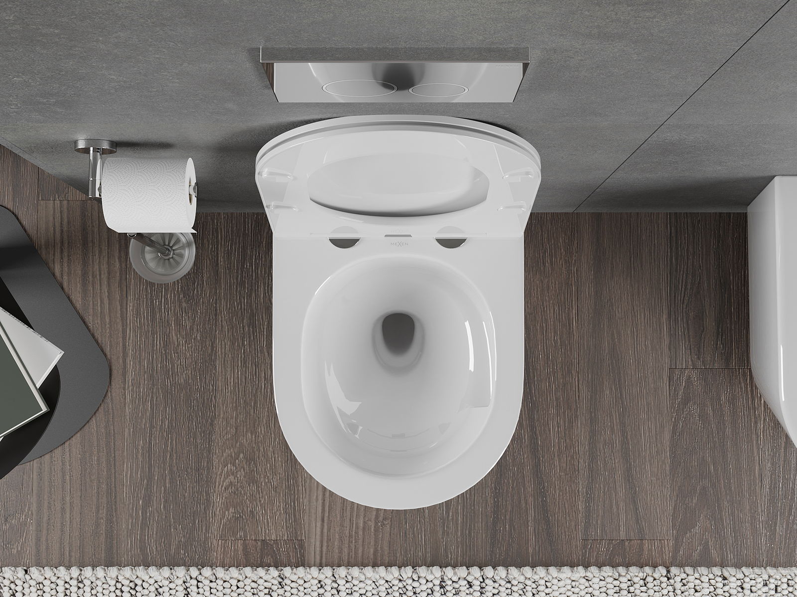 A system characterised by the absence of a traditional rim (rimless) and a specific spiral flushing system that resembles a whirlpool. The flushed water creates a "tornado" effect, quickly and effectively rinsing the entire surface of the bowl, which helps it clean better and prevents dirt from settling.