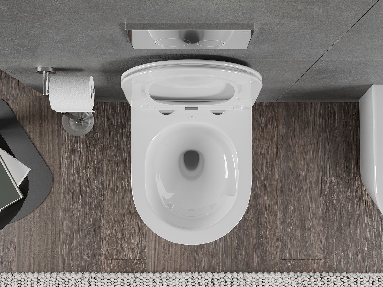A system characterised by the absence of a traditional rim (rimless) and a specific spiral flushing system that resembles a whirlpool. The flushed water creates a "tornado" effect, quickly and effectively rinsing the entire surface of the bowl, which helps it clean better and prevents dirt from settling.