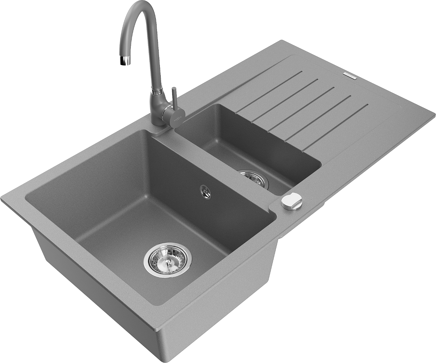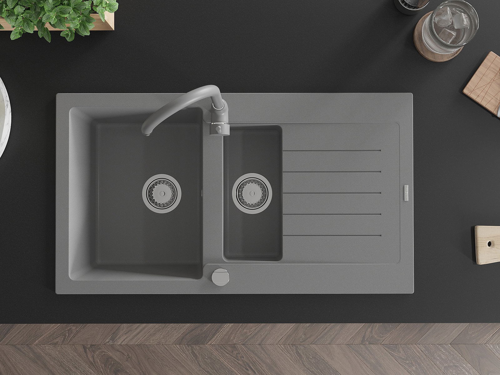 Mexen Matias granite sink 1.5-bowl with drainer and Telma kitchen tap, grey - 6502-71-670200-71