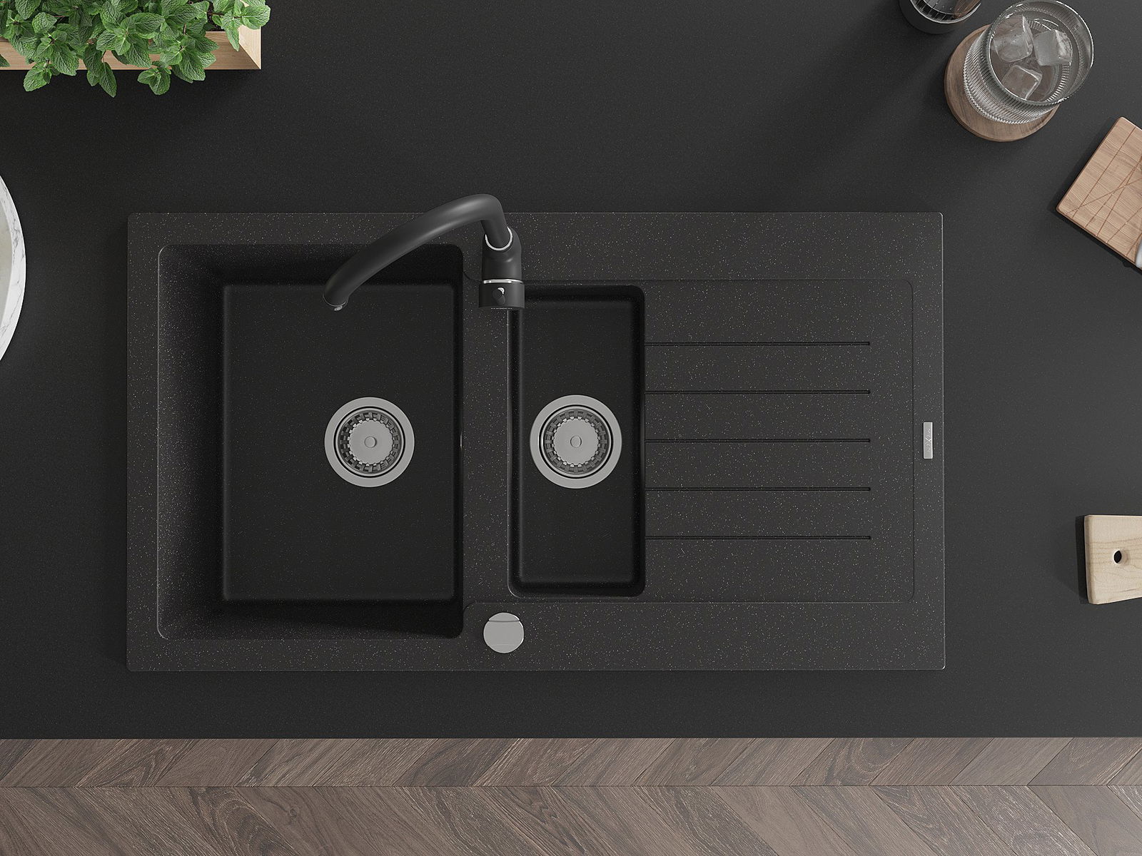 Mexen Matias granite sink 1.5-bowl with drainer and Telma kitchen tap, black/silver - 6502-73-670200-70