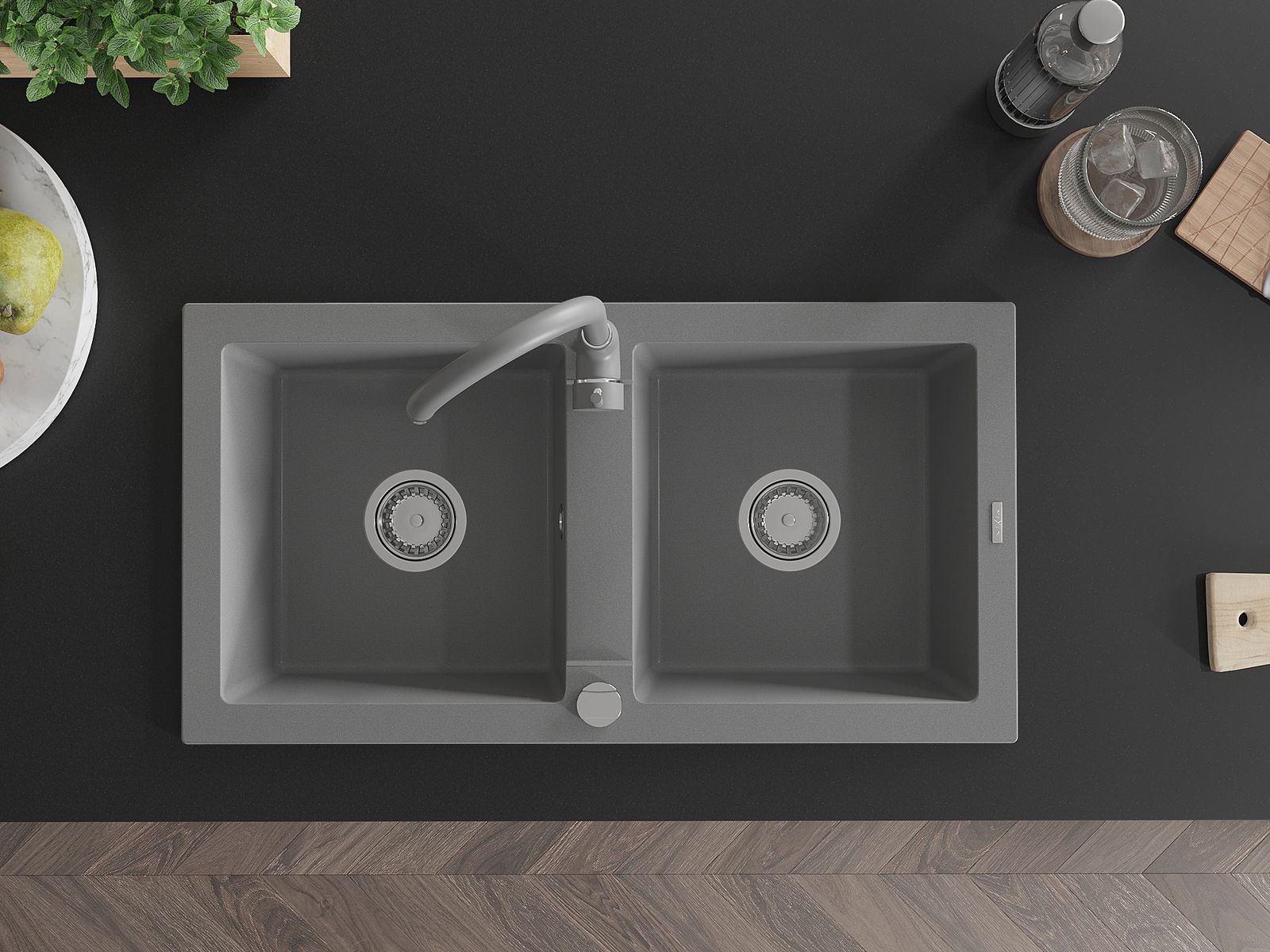 Mexen Mario granite 2-bowl sink with Telma kitchen tap, grey - 6504-71-670200-71