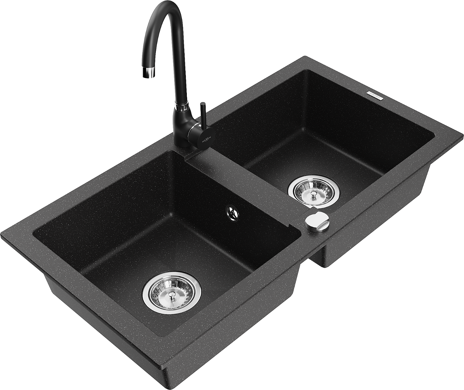 Mexen Mario Granite 2-Bowl Sink with Telma Kitchen Tap, Black/Silver - 6504-73-670200-70