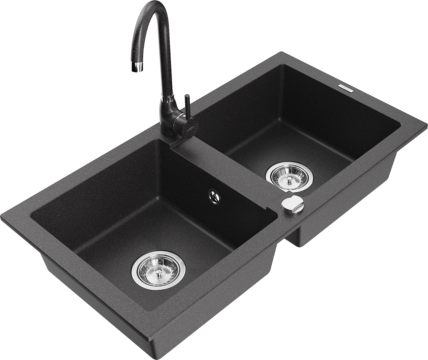 Mexen Mario granite sink 2-bowl with Telma kitchen tap, black speckled - 6504-76-670200-76