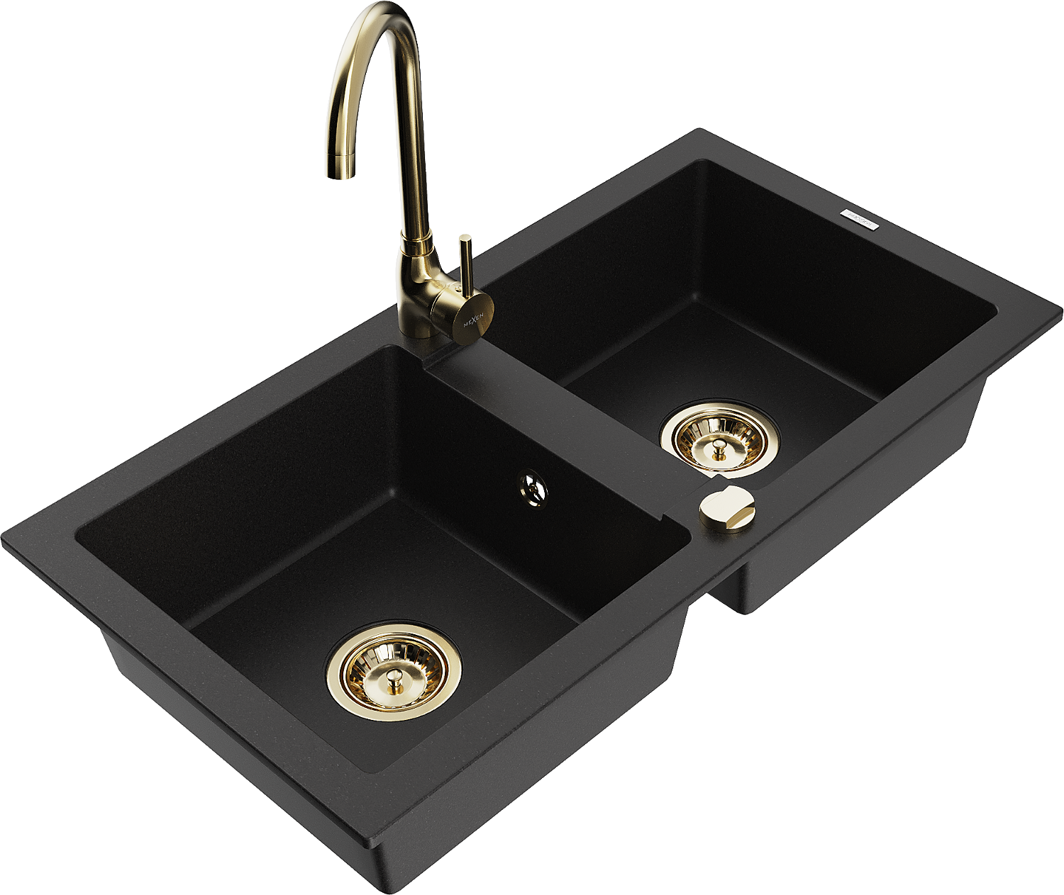 Mexen Mario granite sink 2-bowl with Telma kitchen tap, black - 6504-77-670200-50