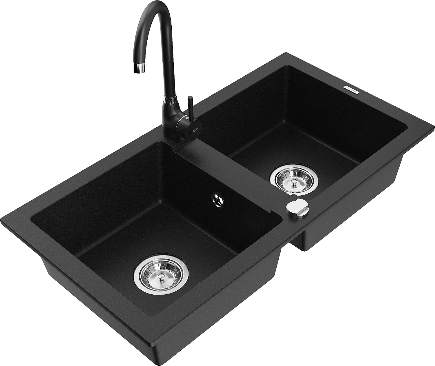 Mexen Mario granite sink 2-chamber with Telma kitchen tap, black - 6504-77-670200-70