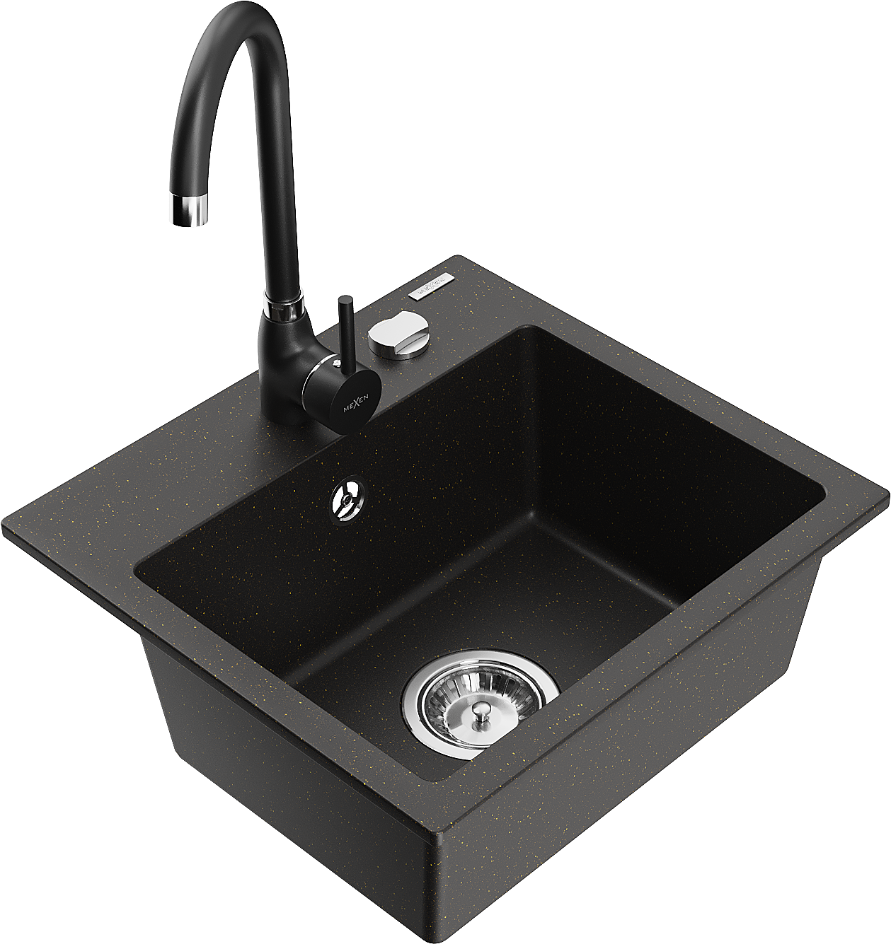 Mexen Milo granite sink with 1 bowl and Telma kitchen tap, black/gold - 6505-75-670200-70