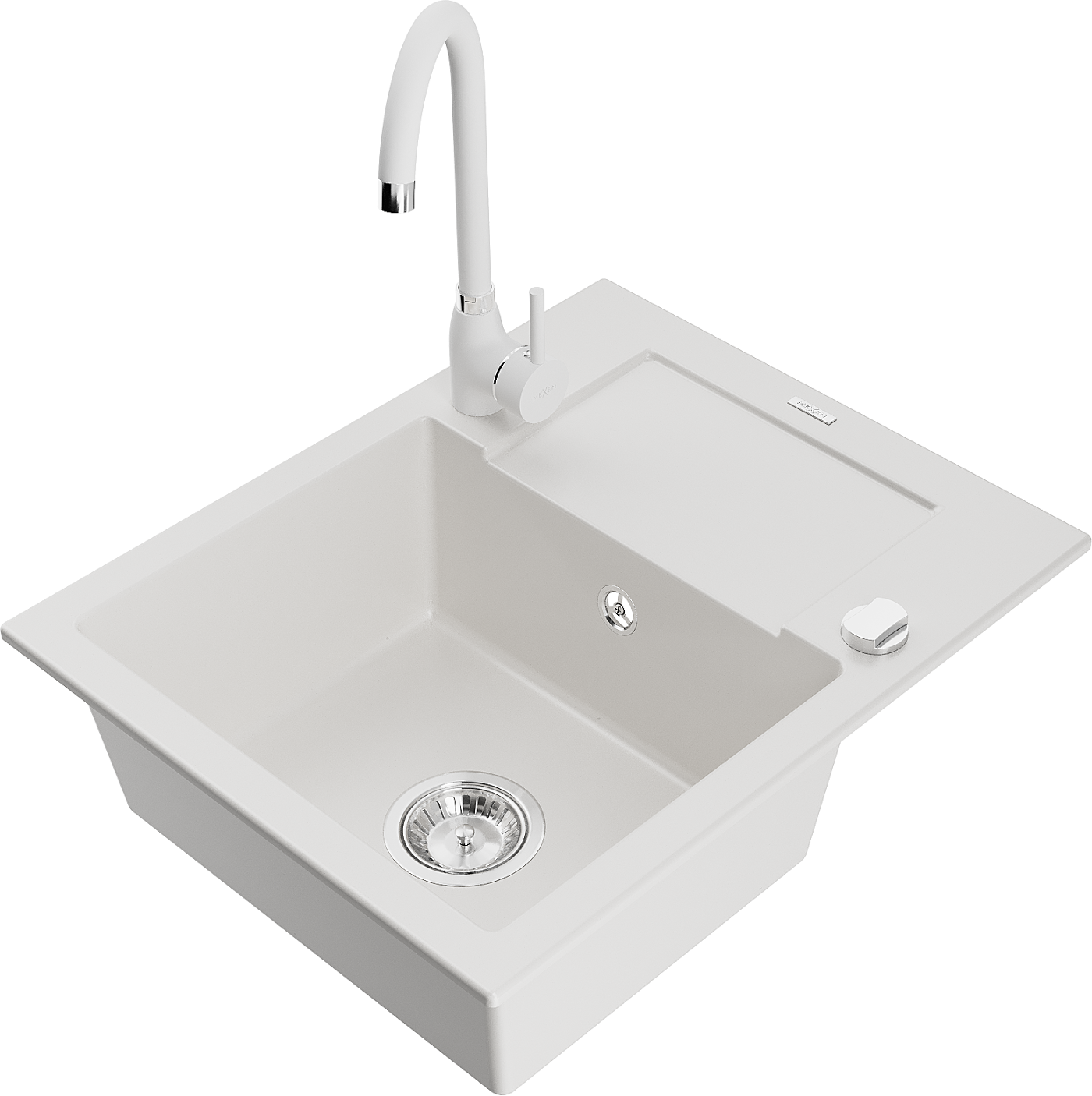 Mexen Enzo granite sink 1-bowl with drainer and Telma kitchen tap, white - 6506-20-670200-20