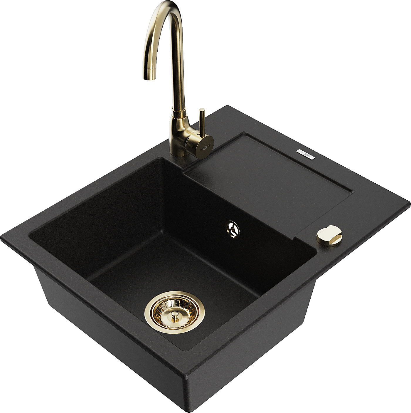 Mexen Enzo 1-bowl granite kitchen sink with drainer and Telma kitchen tap, black - 6506-77-670200-50