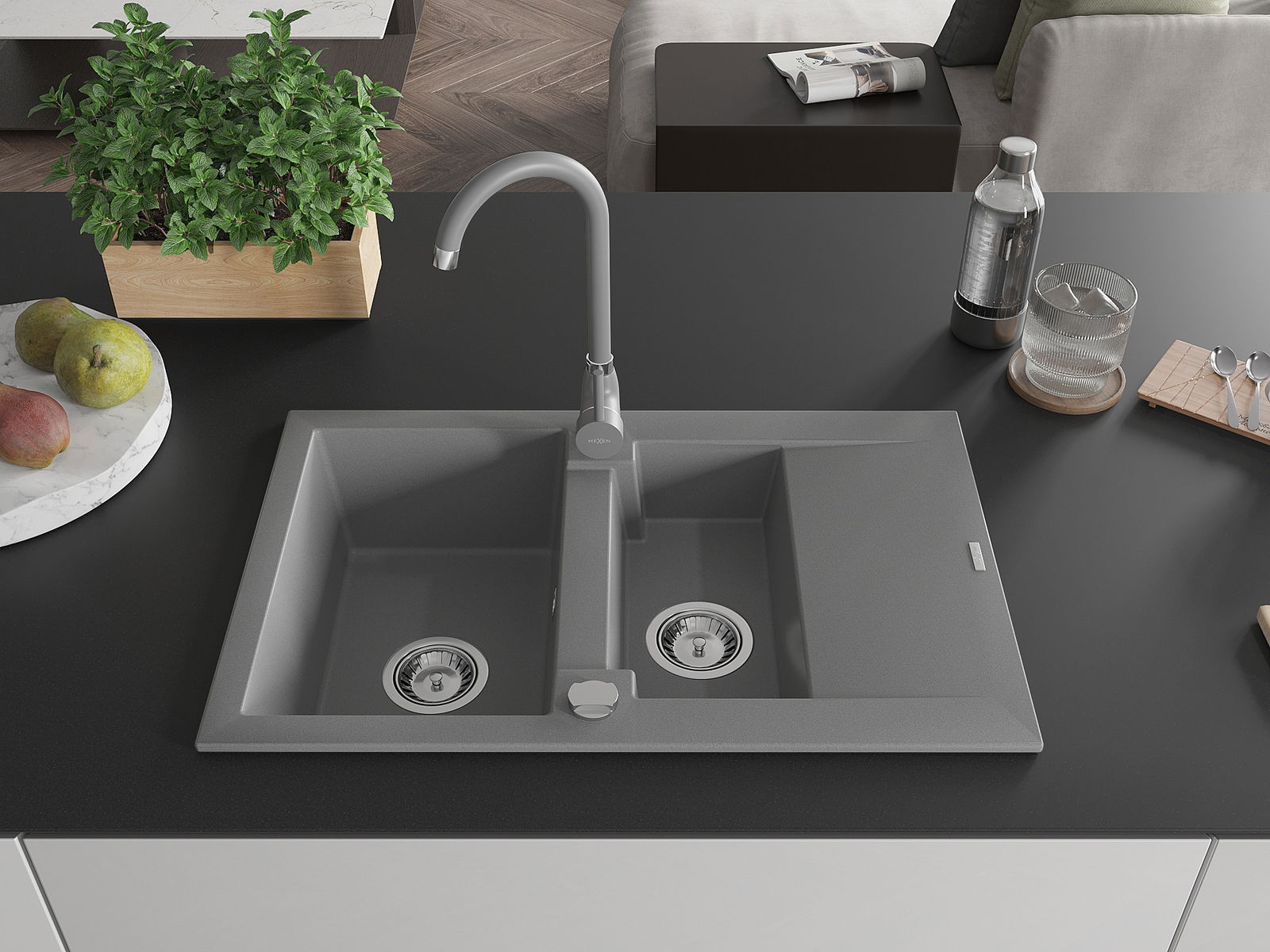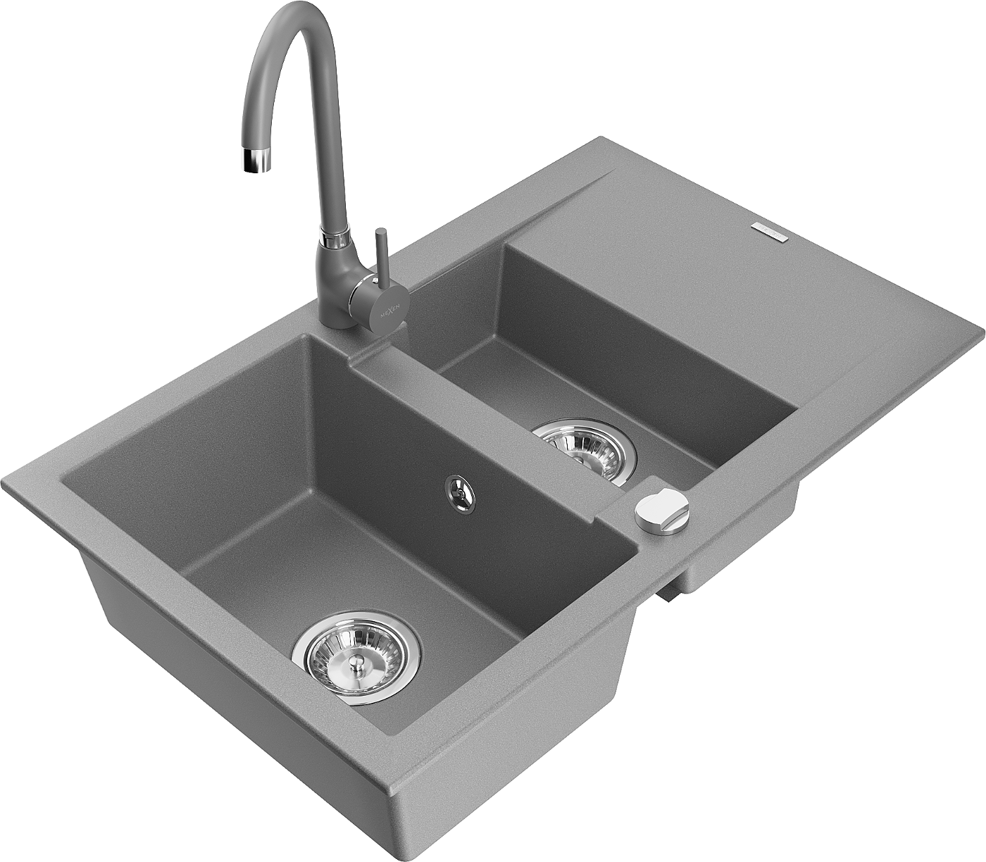 Mexen Gaspar granite sink 1.5-bowl with drainer and Telma kitchen tap, grey - 6507-71-670200-71