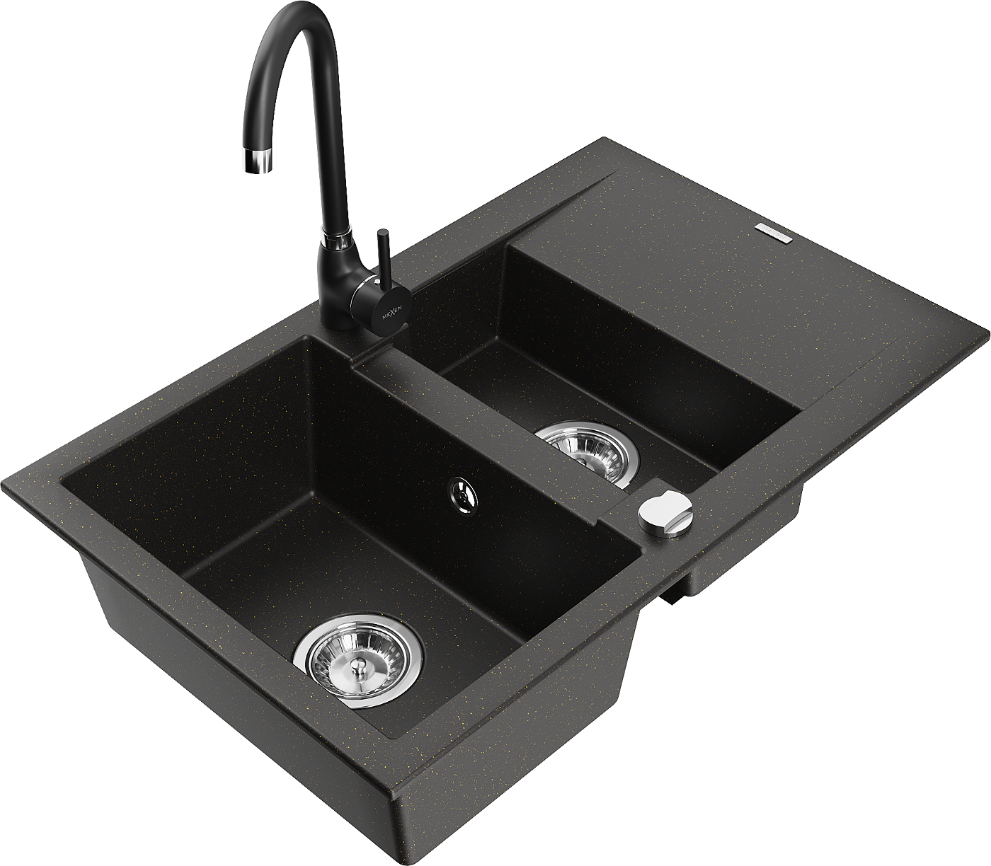 Mexen Gaspar granite sink 1.5-bowl with drainer and Telma kitchen tap, black/gold - 6507-75-670200-70