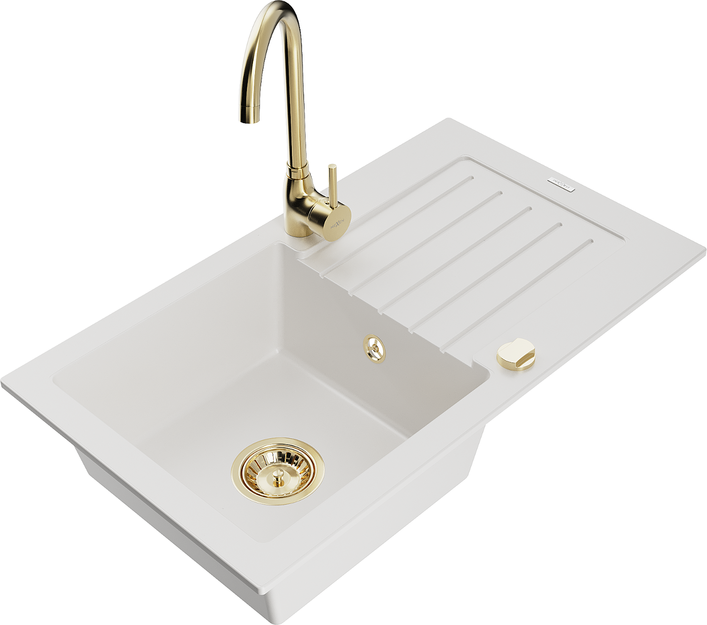 Mexen Pablo 1-bowl granite sink with drainer and Telma kitchen tap, white - 6510-20-670200-50