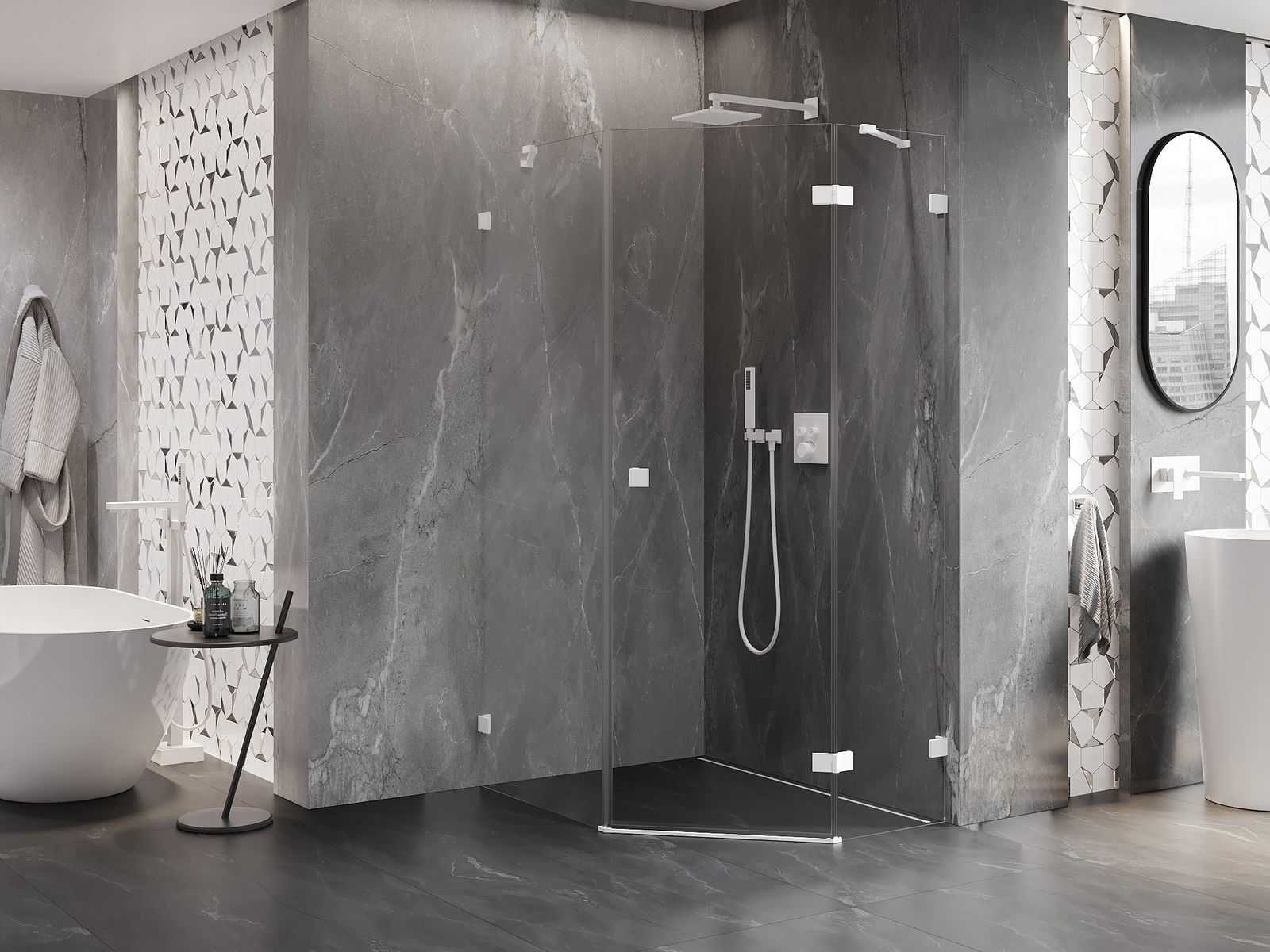 Mexen Lunar pentagonal right-hinged shower enclosure 80 x 90 cm, transparent, white - 831-080P-090L-20-00-P