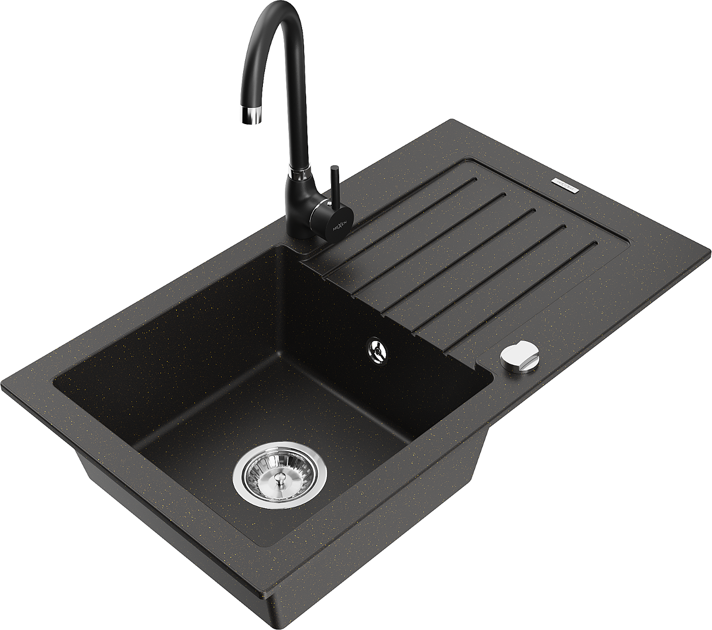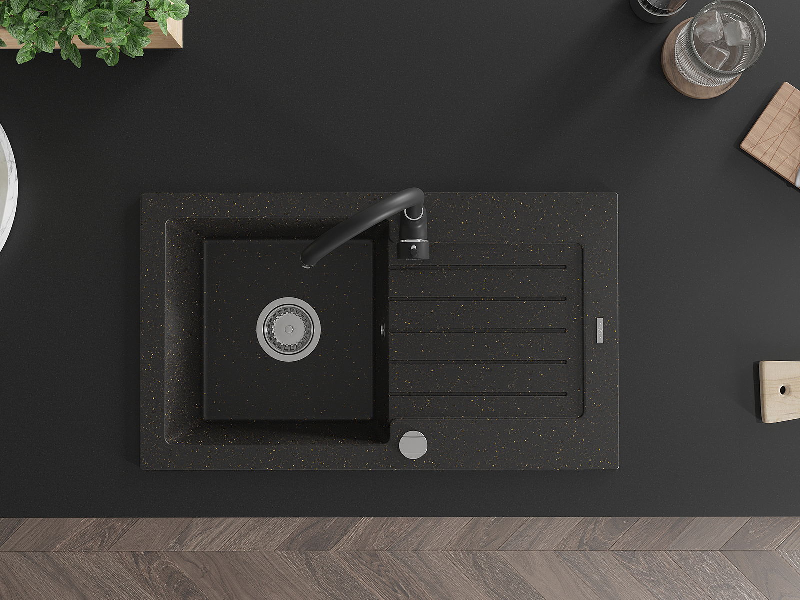Mexen Pablo 1-bowl granite sink with drainer and Telma kitchen tap, black/gold - 6510-75-670200-70