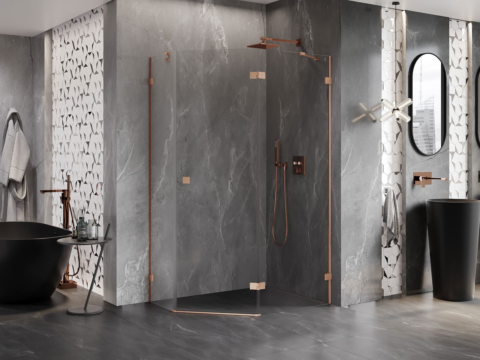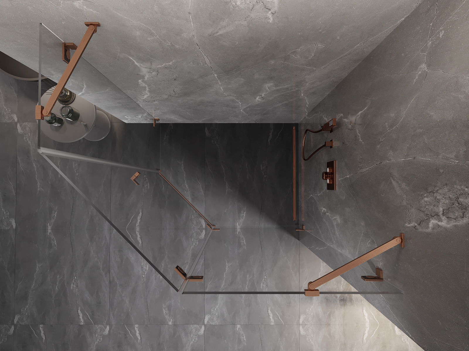 Mexen Lunar pentagon-shaped shower enclosure hinged right 90 x 80 cm, transparent, brushed copper - 831-090P-080L-65-00-P