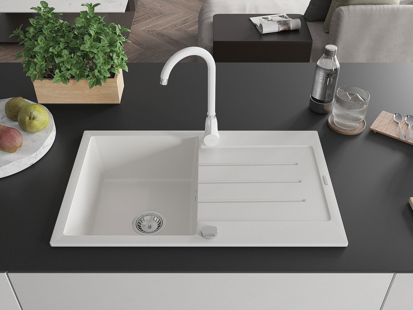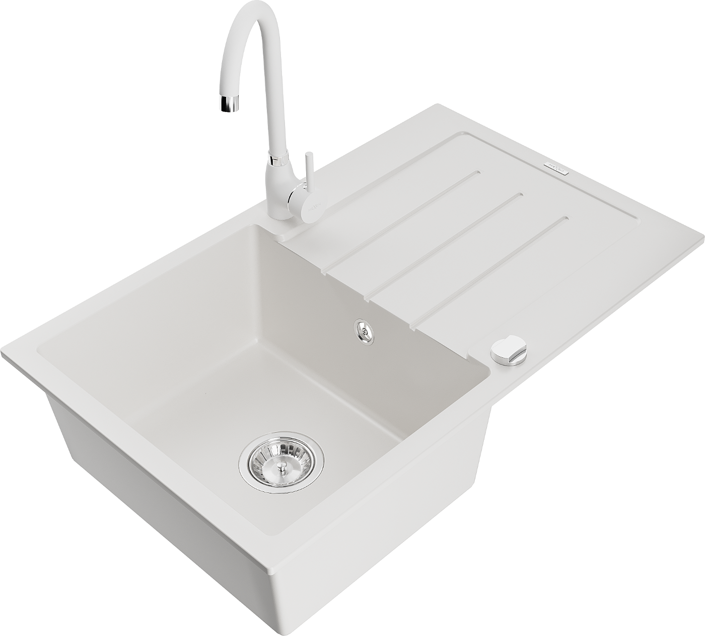 Mexen Bruno granite sink 1-bowl with drainer and Telma kitchen tap, white - 6513-20-670200-20