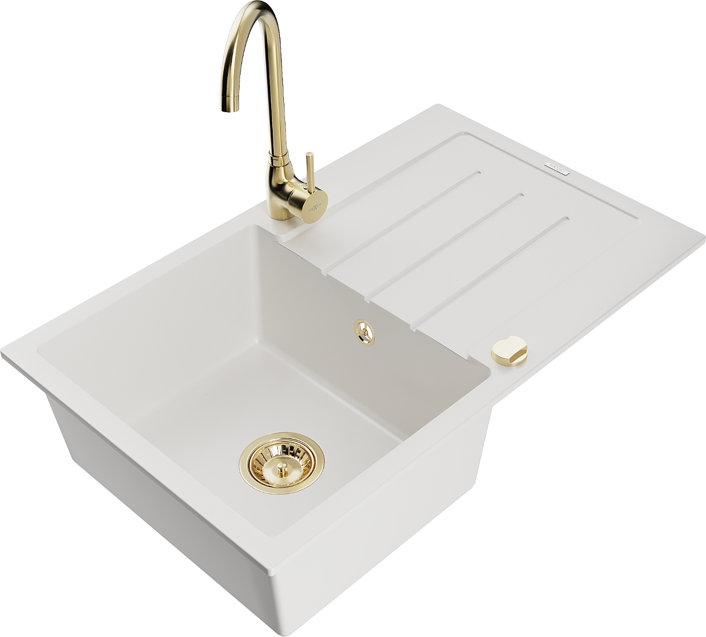 Mexen Bruno granite sink 1-bowl with drainer and Telma kitchen tap, white - 6513-20-670200-50
