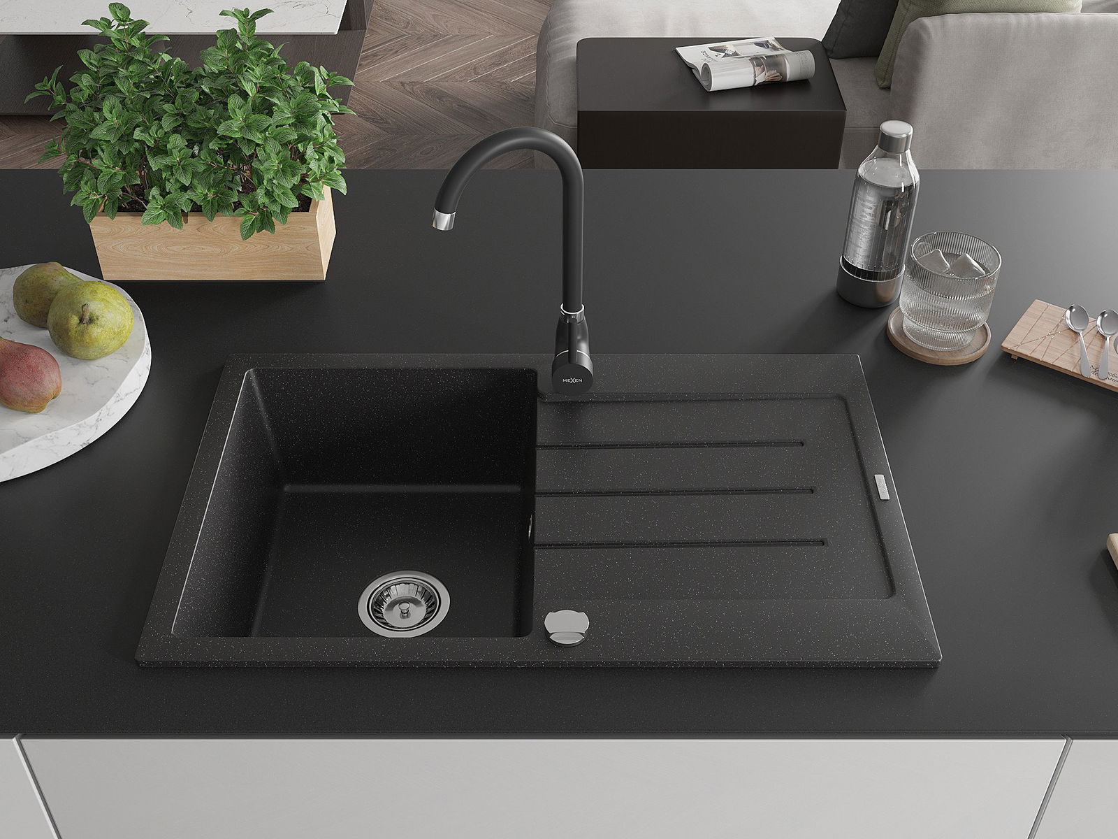 Mexen Bruno granite sink 1-bowl with drainer and Telma kitchen tap, black/silver - 6513-73-670200-70