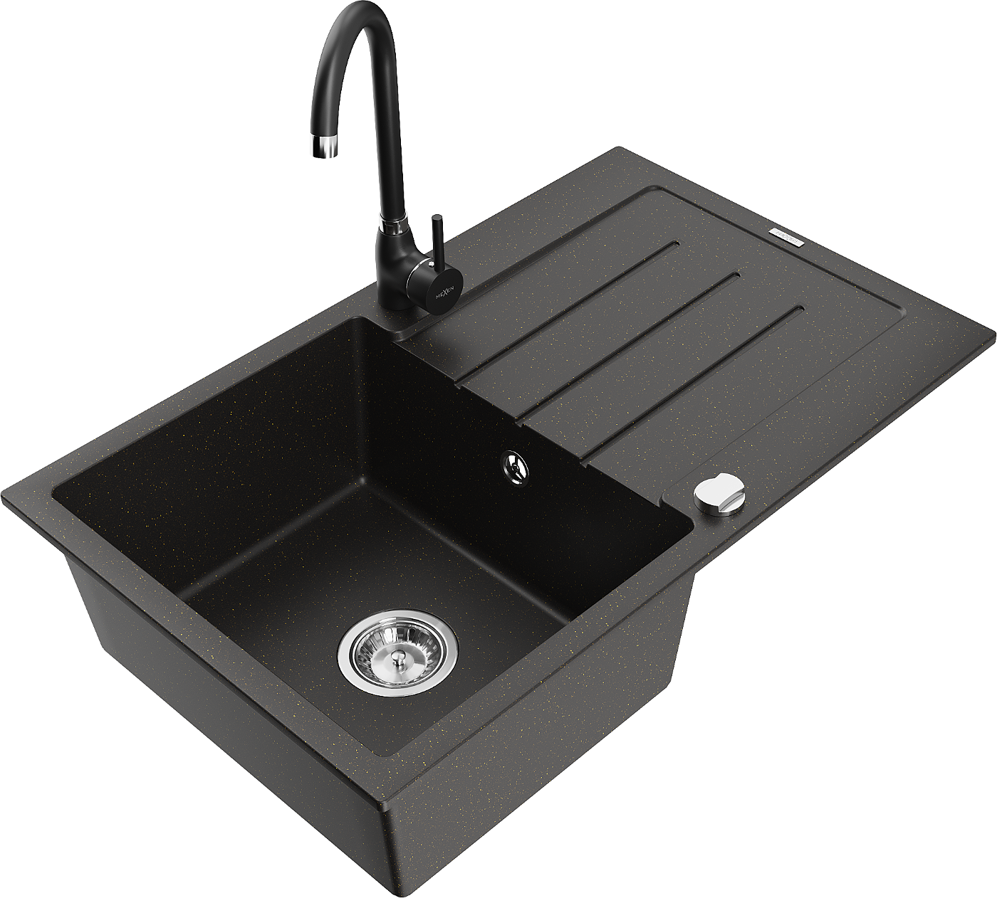Mexen Bruno granite kitchen sink 1-bowl with drainer and Telma kitchen tap, black/gold - 6513-75-670200-70