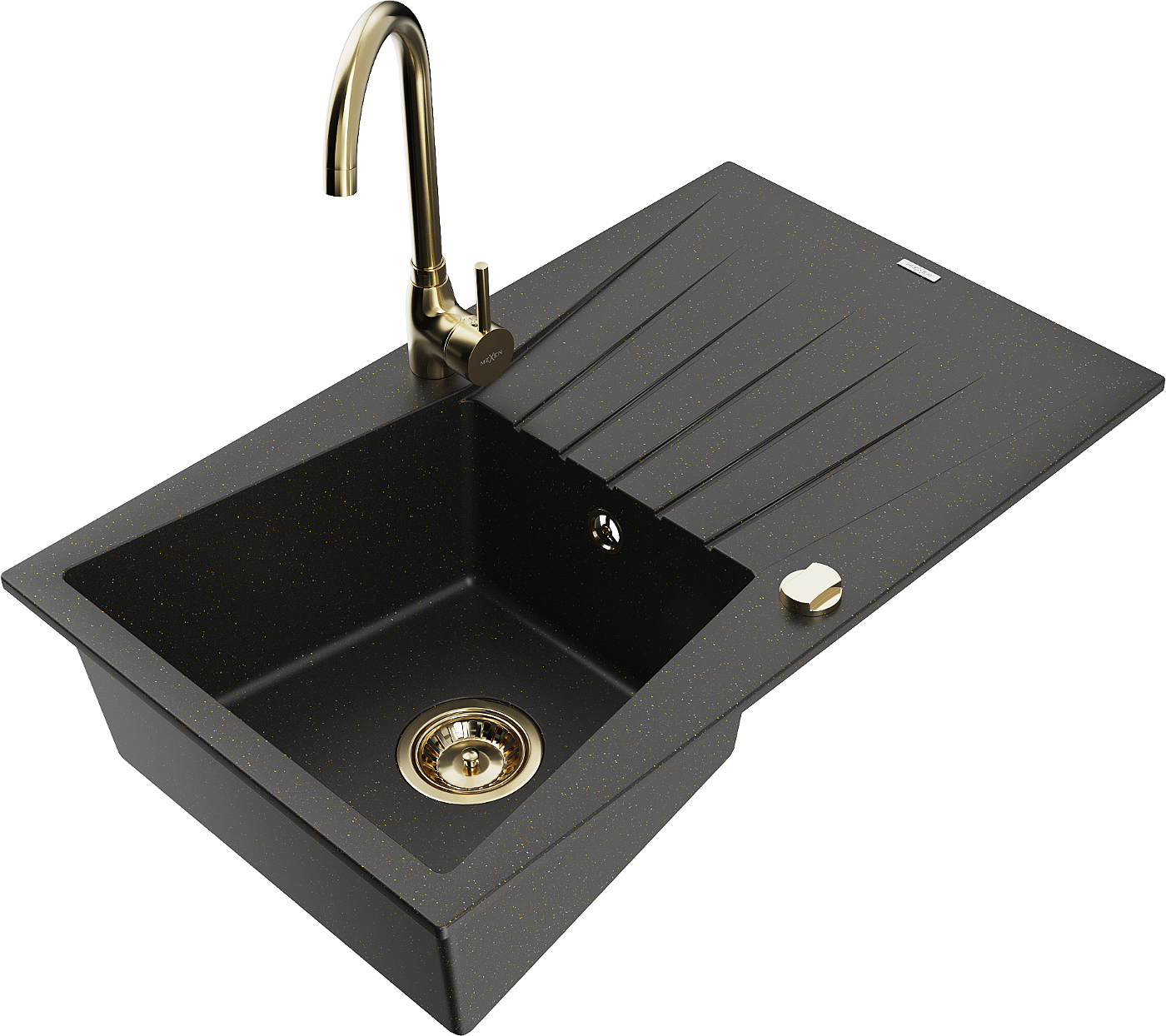 Mexen Cesar granite sink 1-bowl with drainer and Telma kitchen tap, black/gold - 6514-75-670200-50