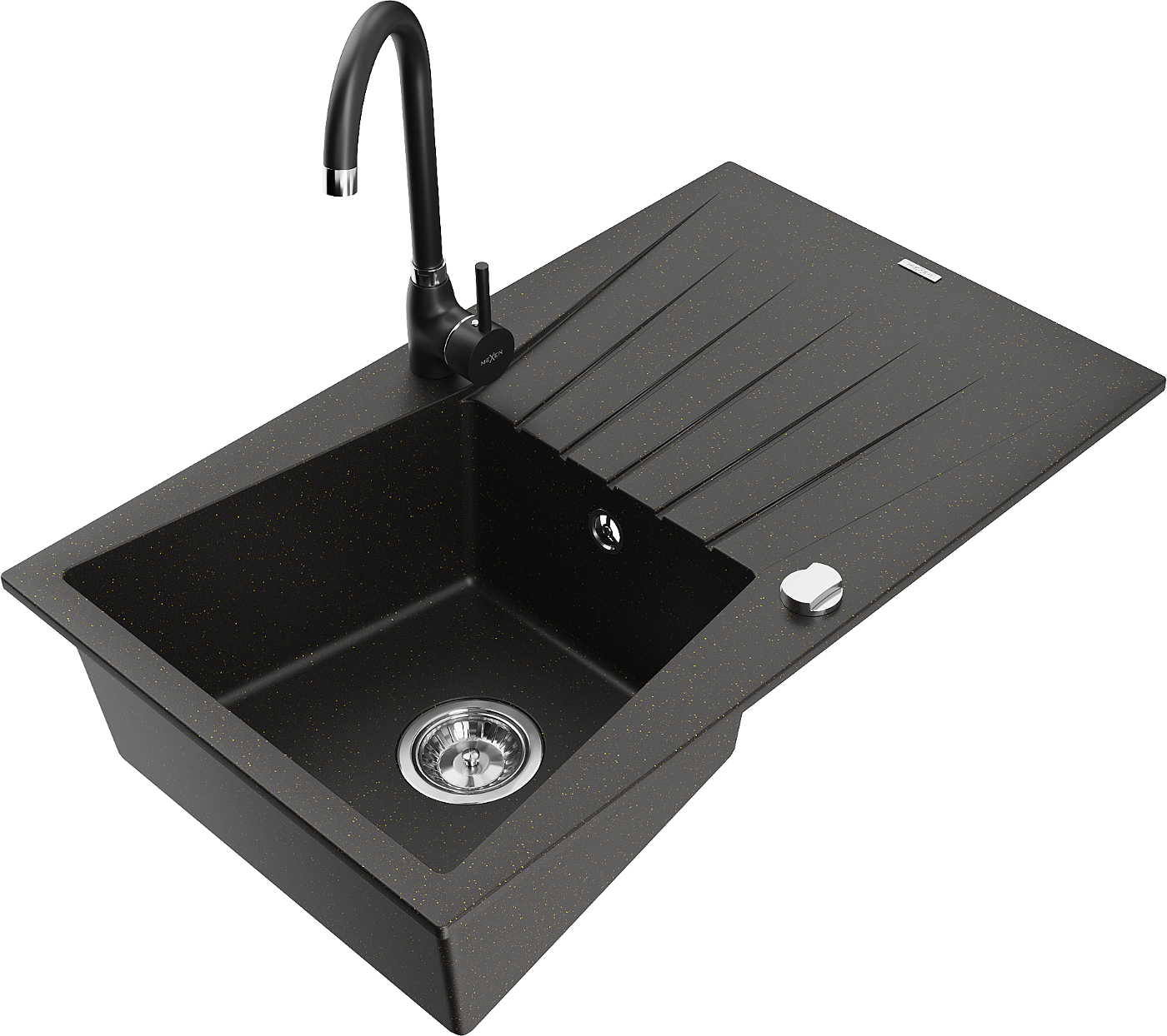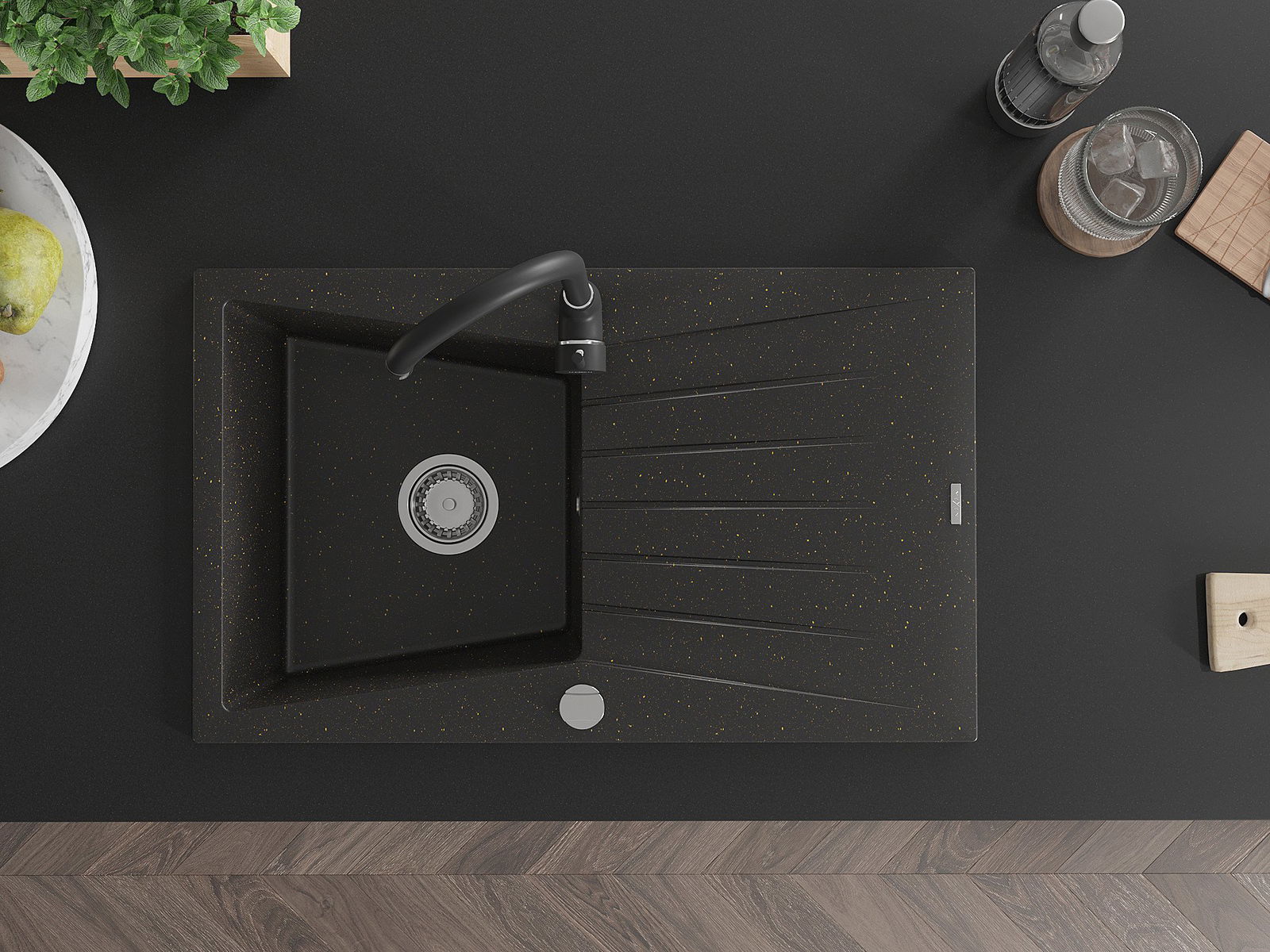 Mexen Cesar granite sink 1-bowl with drainer and kitchen tap Telma, black/gold - 6514-75-670200-70