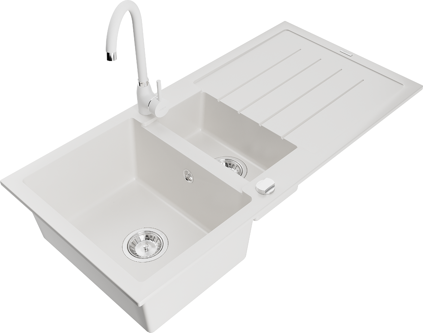 Mexen Andres granite sink 1.5-bowl with drainer and Telma kitchen tap, white - 6515-20-670200-20