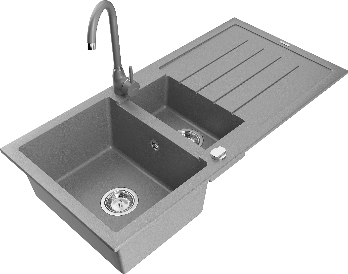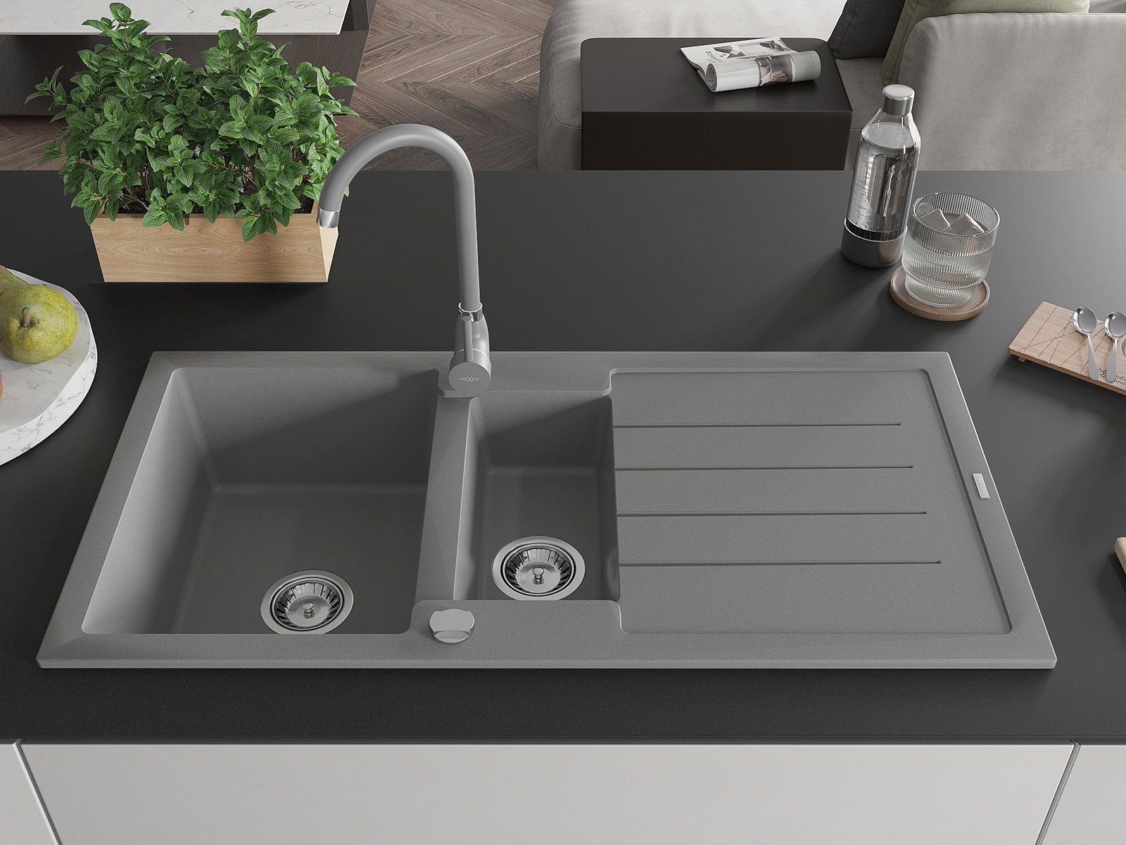 Mexen Andres granite sink 1.5-bowl with drainer and Telma kitchen tap, grey - 6515-71-670200-71