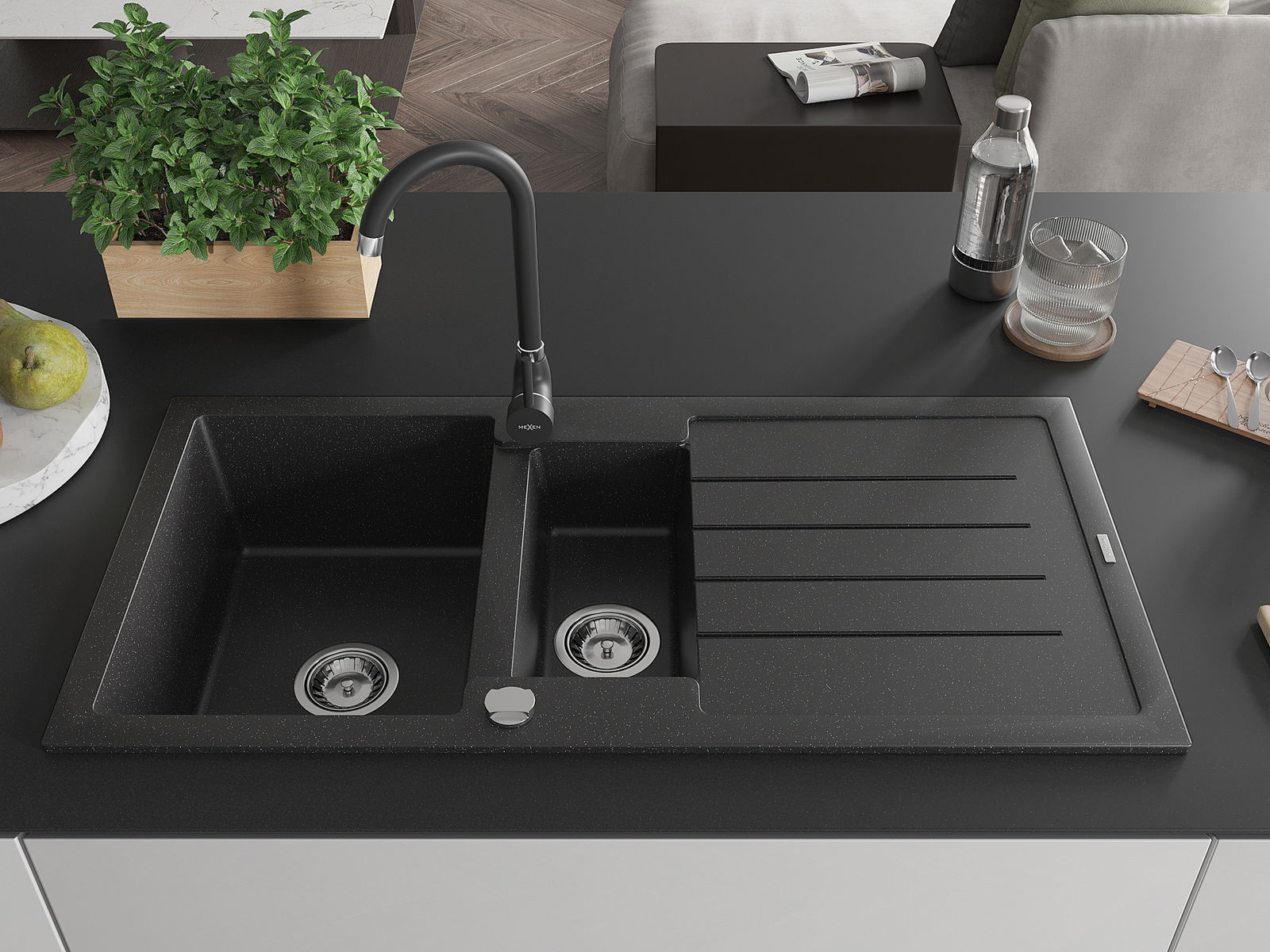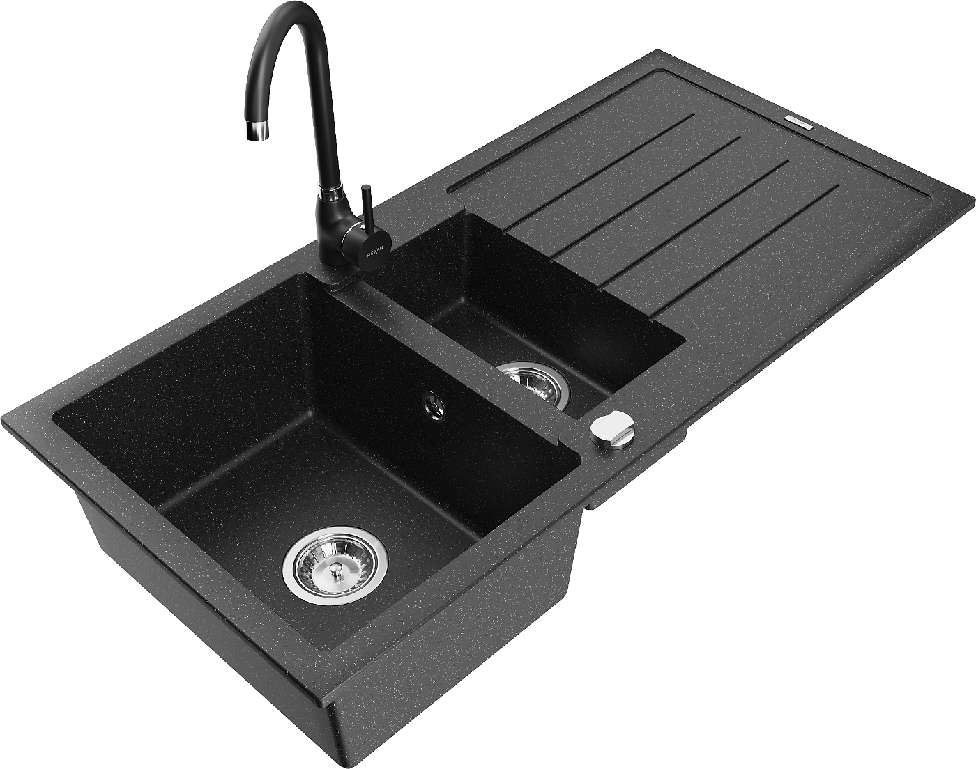 Mexen Andres 1.5-bowl granite sink with drainer and Telma kitchen tap, black/silver - 6515-73-670200-70